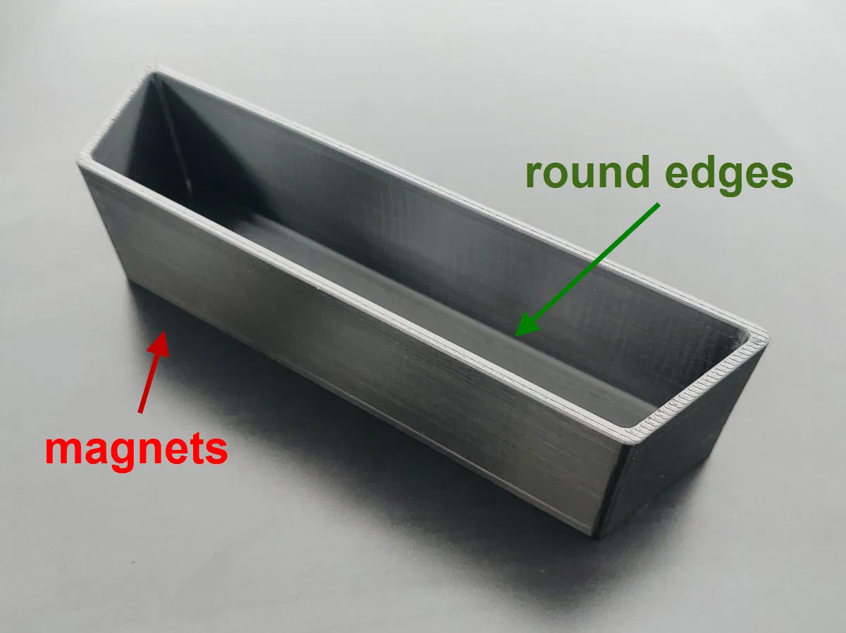 Bốn nam châm neodym “tàng hình” (10x10x5mm) giữ khay cố định mà không cần dùng ốc vít hay băng keo hai mặt. Các mép được bo tròn để dễ vệ sinh.