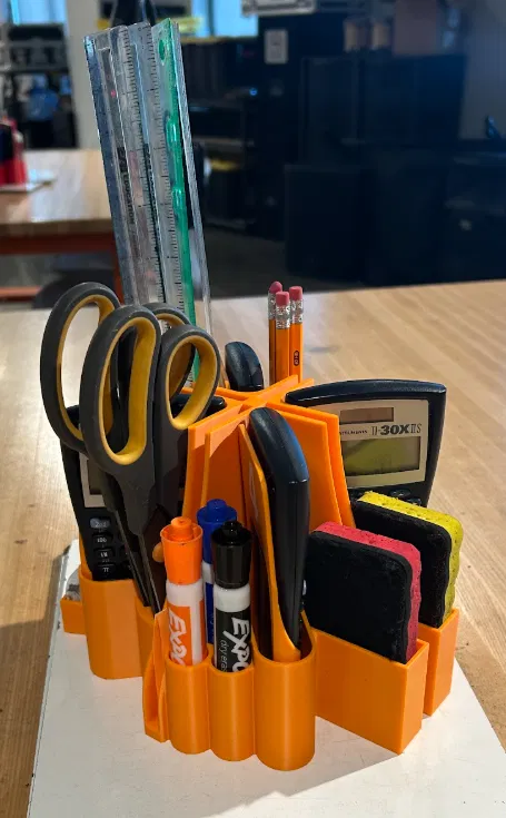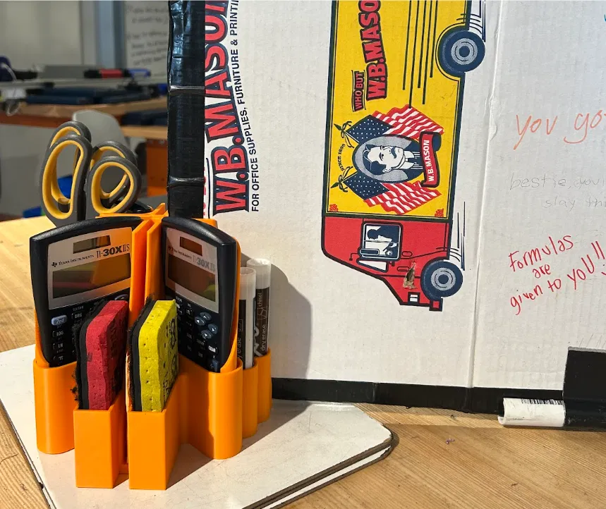 Trước đó đã có một phiên bản do thầy/cô của mình là @MCdeltaT_264915 tạo để đựng test dividers và máy tính, nhưng ở bàn học sinh còn cần nhiều thứ khác nữa. Trên mạng không có mẫu nào được đăng, nên mình phải upload mẫu này như một model gốc, nhưng lưu ý là thực ra đây là một bản remix. Mục tiêu của mình là tận dụng không gian sẵn có để đồ dùng dễ lấy hơn, giúp thời gian trên lớp được dùng hiệu quả hơn cho việc học.