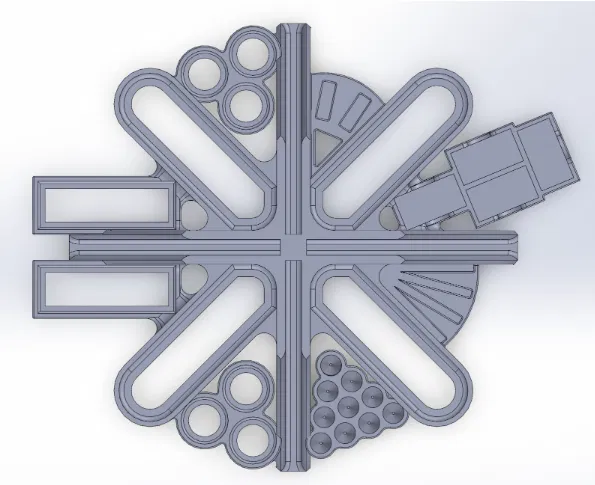 Sau khi tạo phiên bản mới thì khá khó để đem lại thiết kế khay gôm cũ, nên mình phải dựng lại. Mình tạo boss extrude cho các “pocket” và không merge, tạo thêm một extrude cho phần đáy và cũng không merge, rồi tạo cut extrude ở hai bên chỉ tác động lên body Boss-Extrude23. Sau đó mình fillet các cạnh của phần cut và toàn bộ phần trên và cạnh bên. Mình combine hai extrude thành một body, mirror nó qua top plane và right plane cùng lúc, rồi dùng Body-Delete/Keep để xoá hai body dư. Cuối cùng, mình combine hai khay gôm còn lại với kết cấu chính, thành một body.