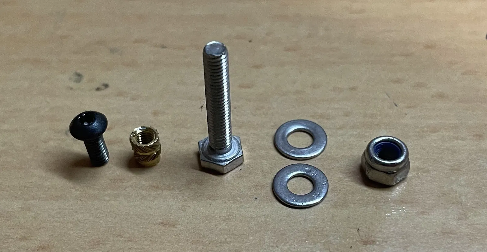 Ướm thử (dry fit) rồi dán (mình dùng epoxy 5 phút) các m3 16mm hexagonal bolts. Đảm bảo ấn vô hết cỡ và dùng vật thẳng để kiểm tra tất cả có thẳng hàng không.