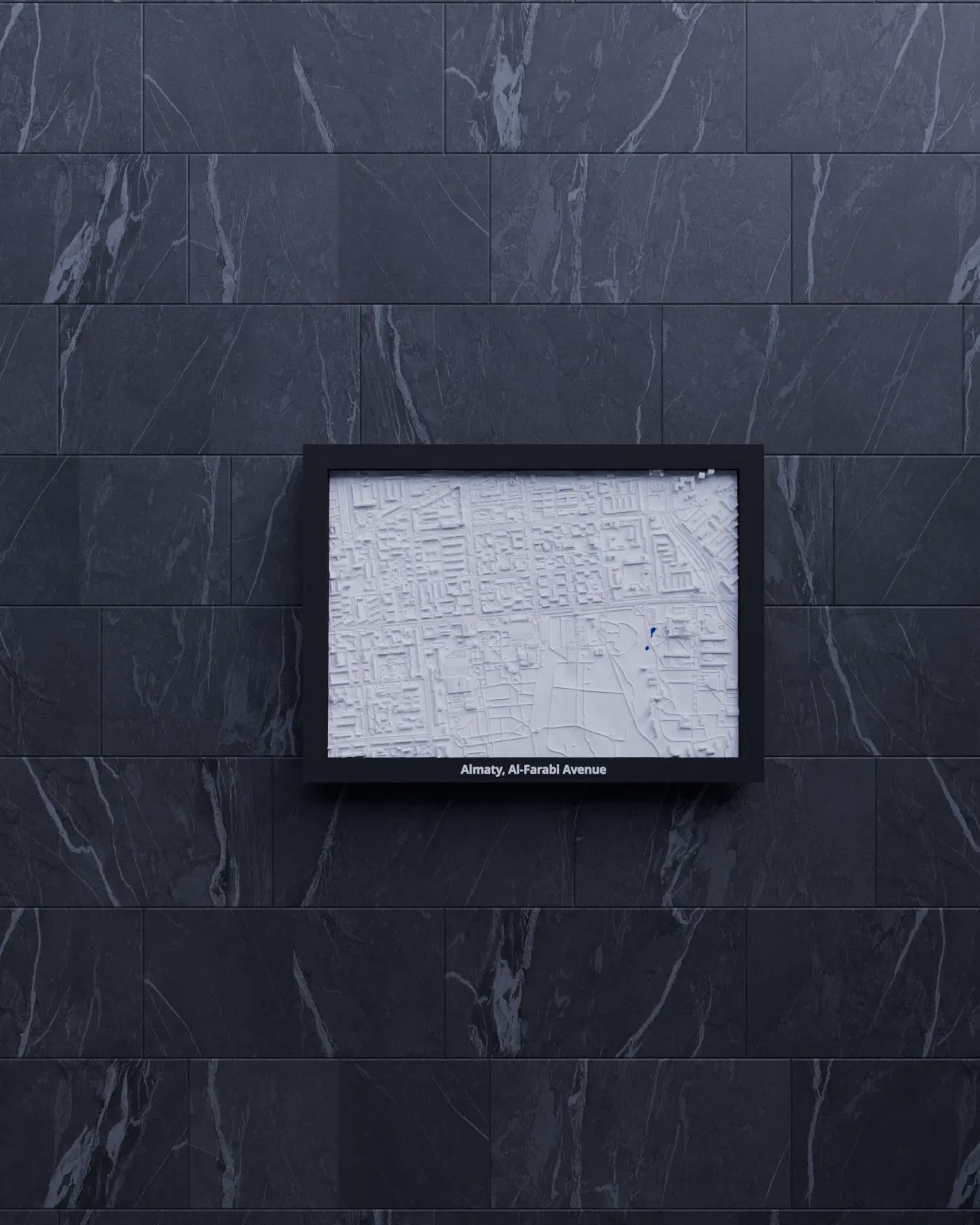 Mô hình địa hình thu nhỏ in 3D tái hiện khu vực Almaty, Al-Farabi Avenue (Kazakhstan) từ dữ liệu địa lý, tỷ lệ ~14913:1. Phù hợp trưng bày, giáo dục, trực quan hóa kiến trúc; có nhiều lựa chọn frame và lỗ treo.