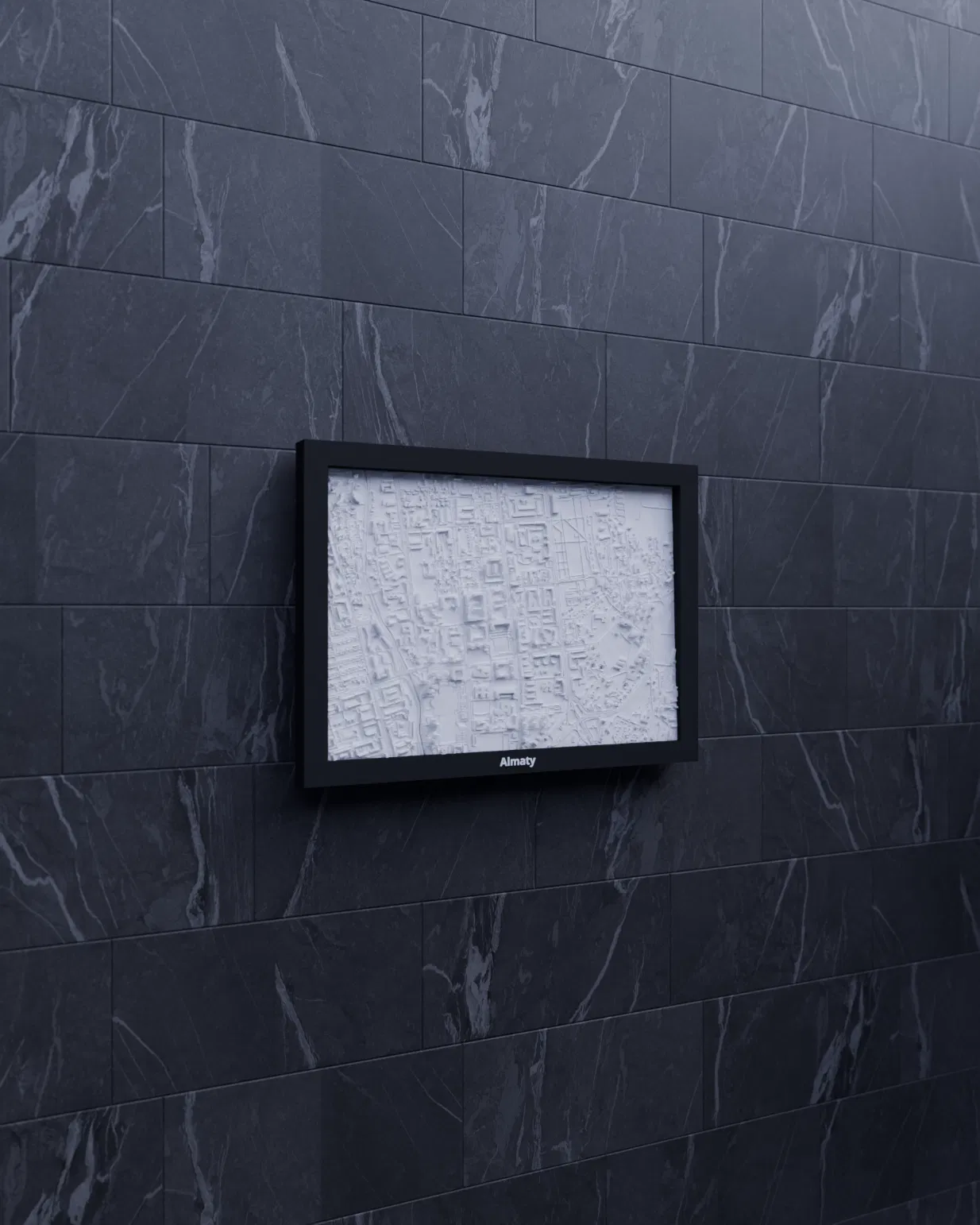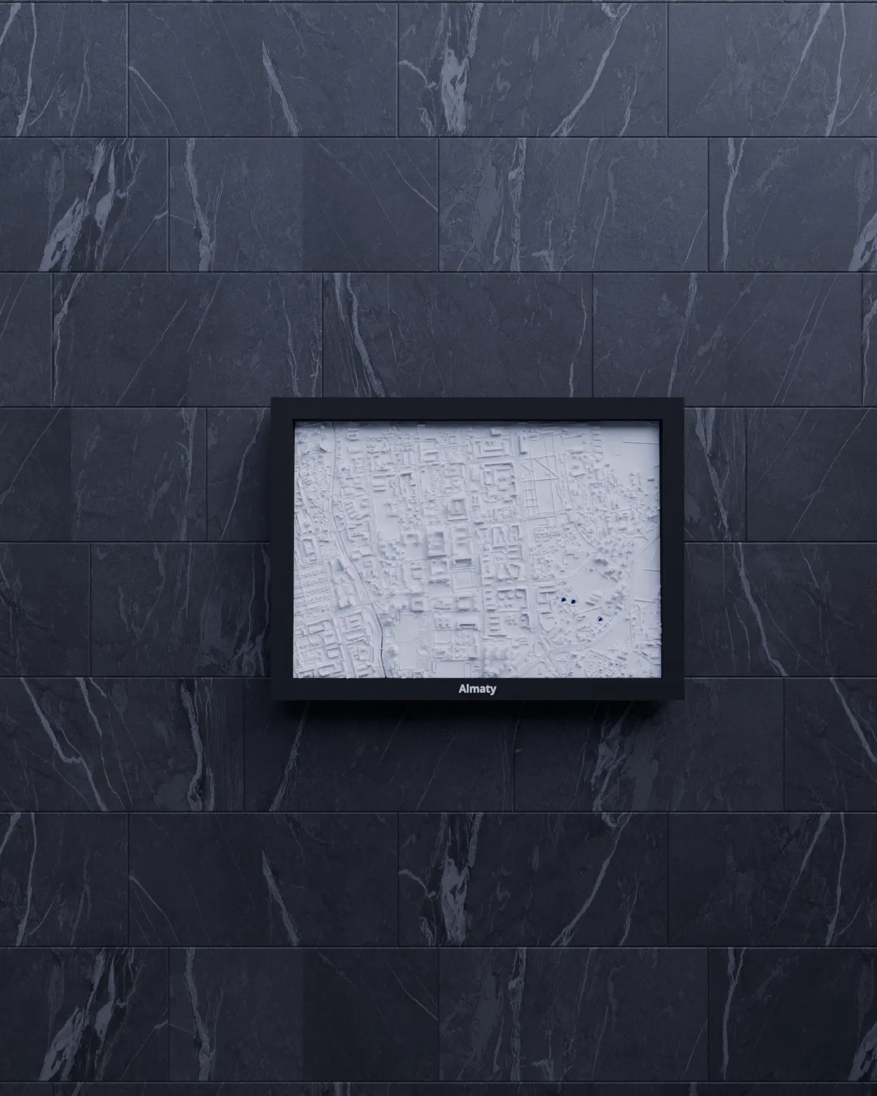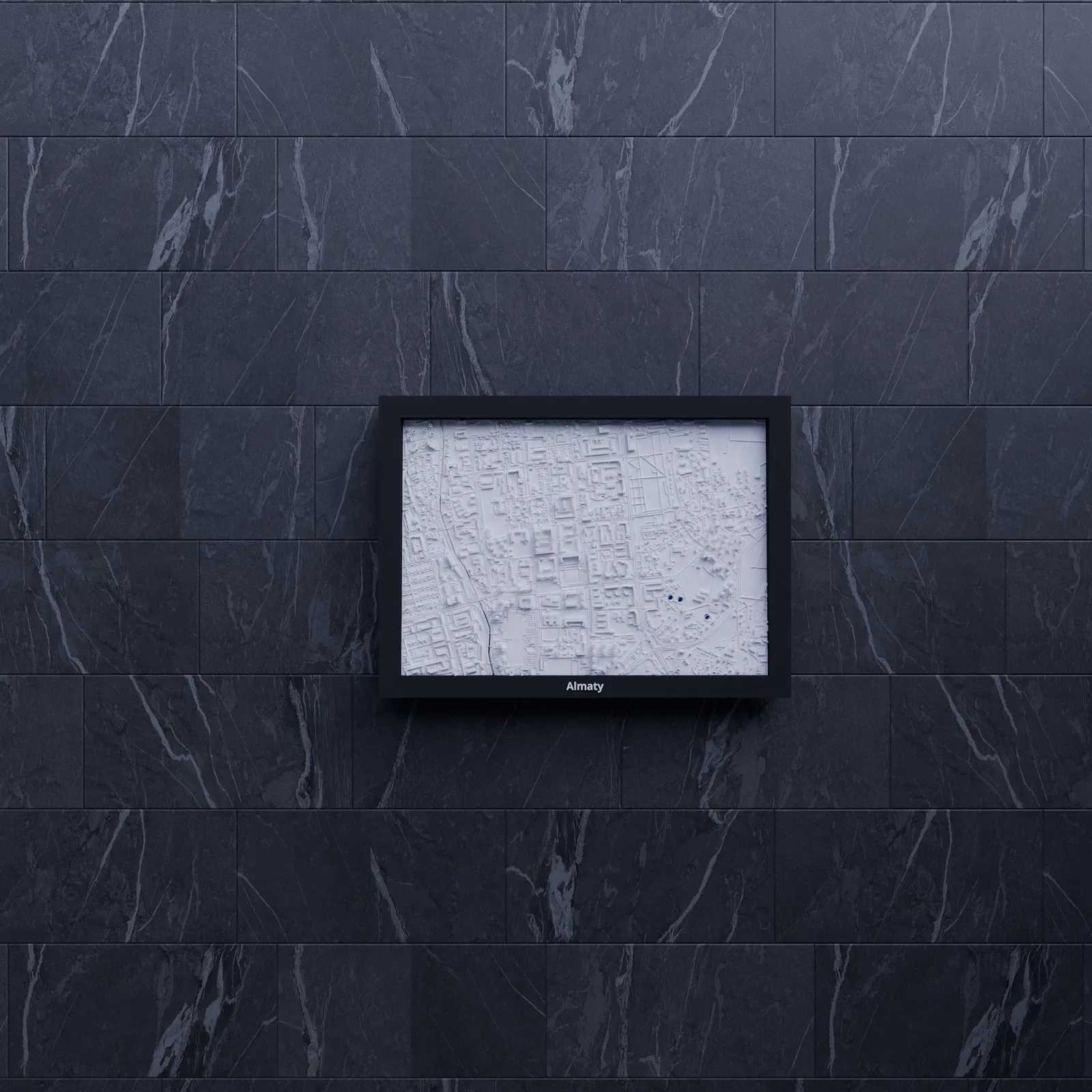 Mô hình thu nhỏ địa hình 3D của Almaty (Kazakhstan), dựng từ dữ liệu địa lý quanh tọa độ 43.208, 76.899. Thu nhỏ từ 2.818 km x 1.968 km xuống 170.5 x 119.5 mm, kèm nhiều lựa chọn frame có/không khắc chữ.