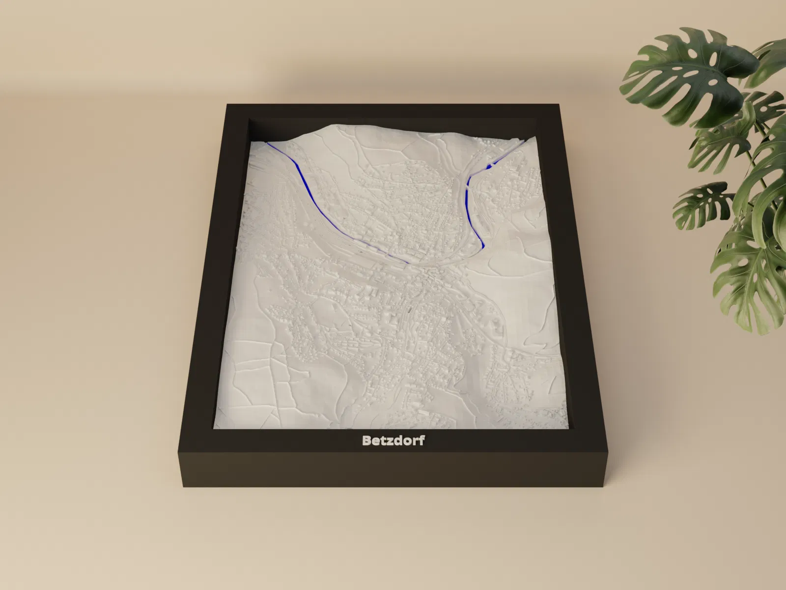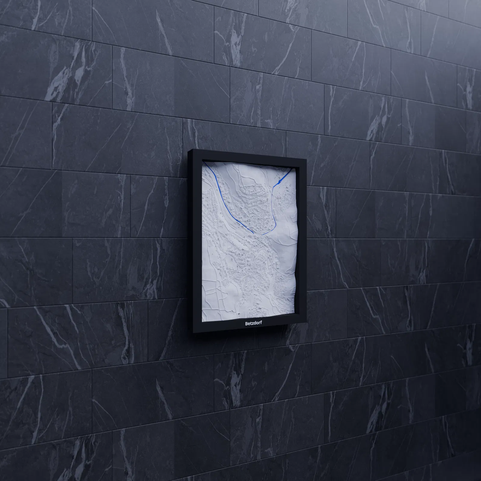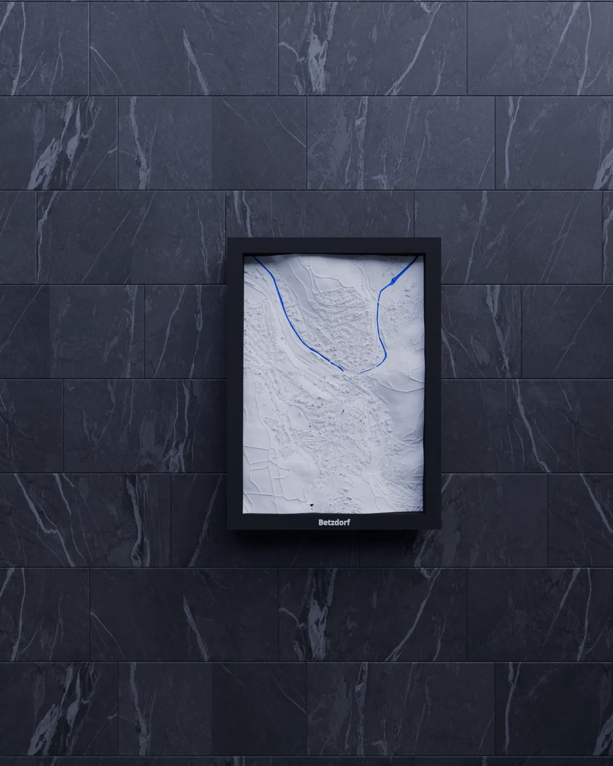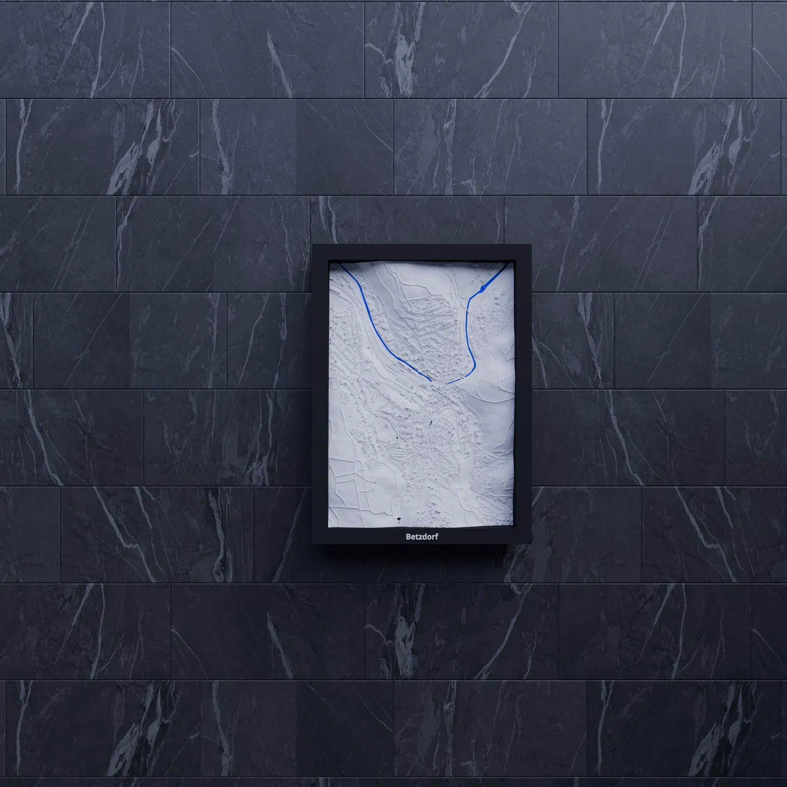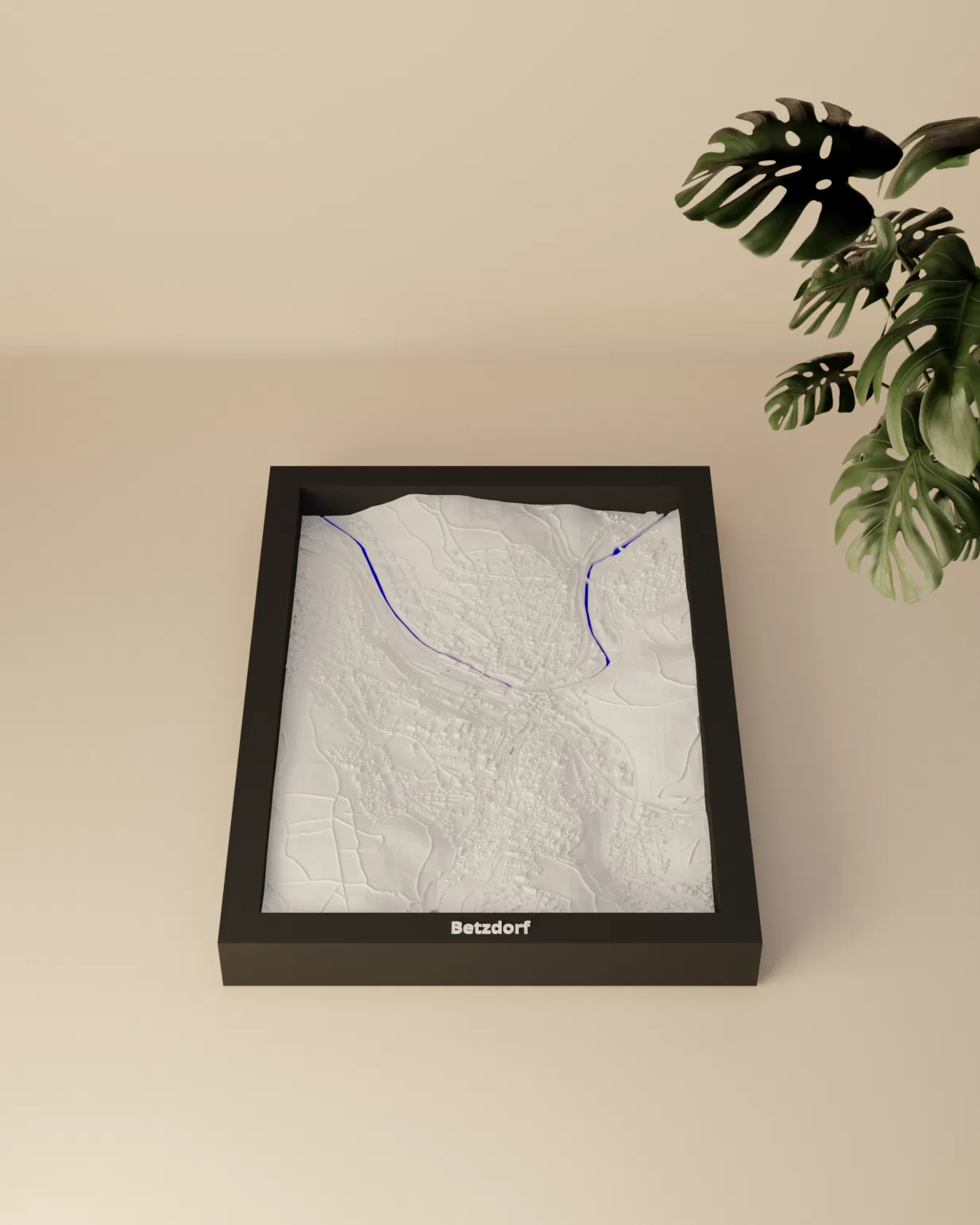 Mô hình địa hình 3D thu nhỏ Betzdorf (Đức), dựng từ dữ liệu địa lý để tái hiện terrain chân thực. Khu vực 1.976 x 2.811 km được thu về 119.5 x 170.5 mm, tỷ lệ ~16537:1; có khung kèm lỗ treo.