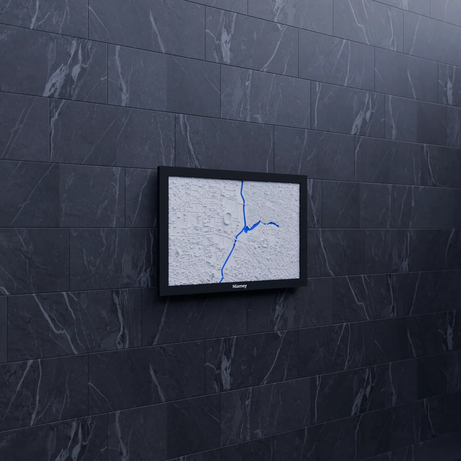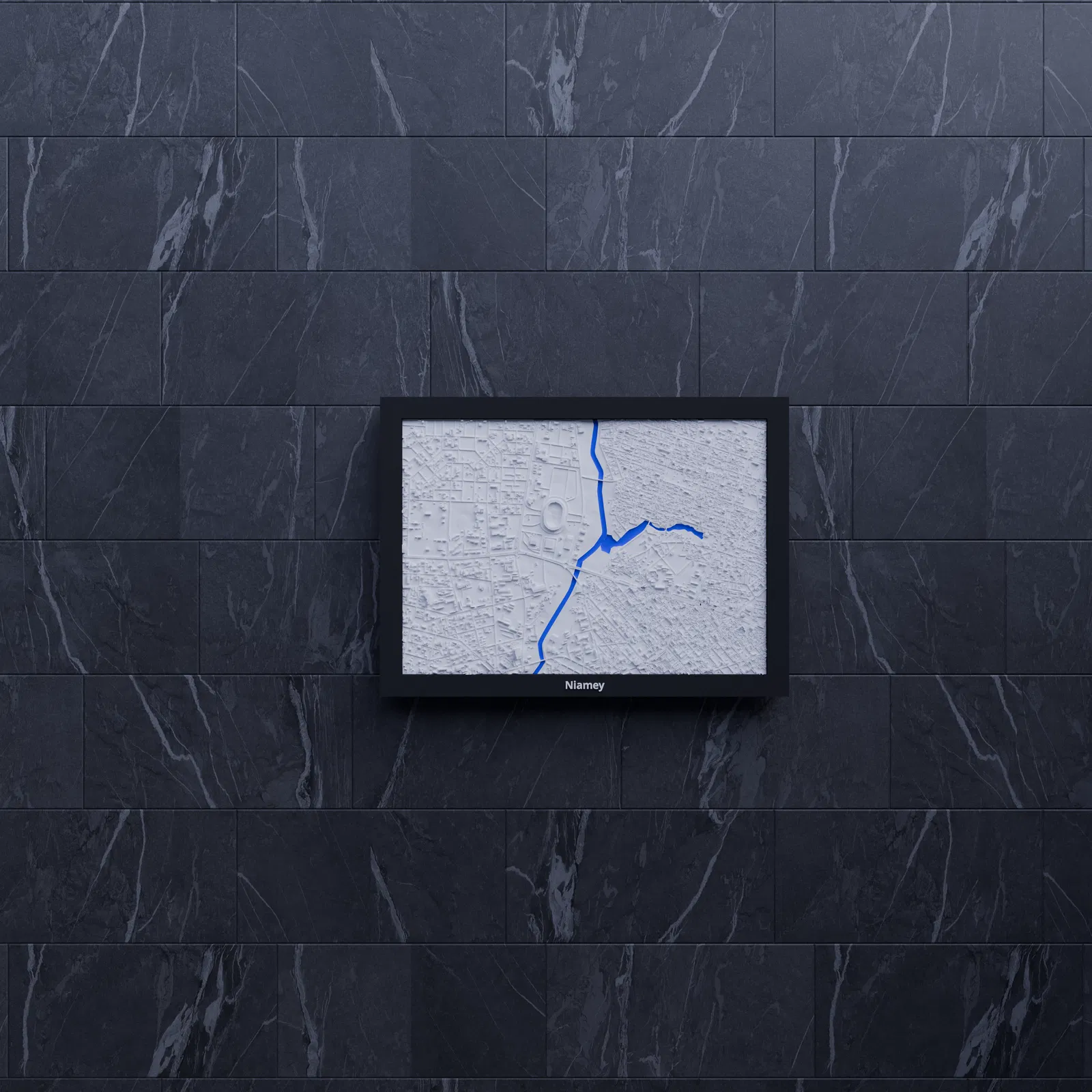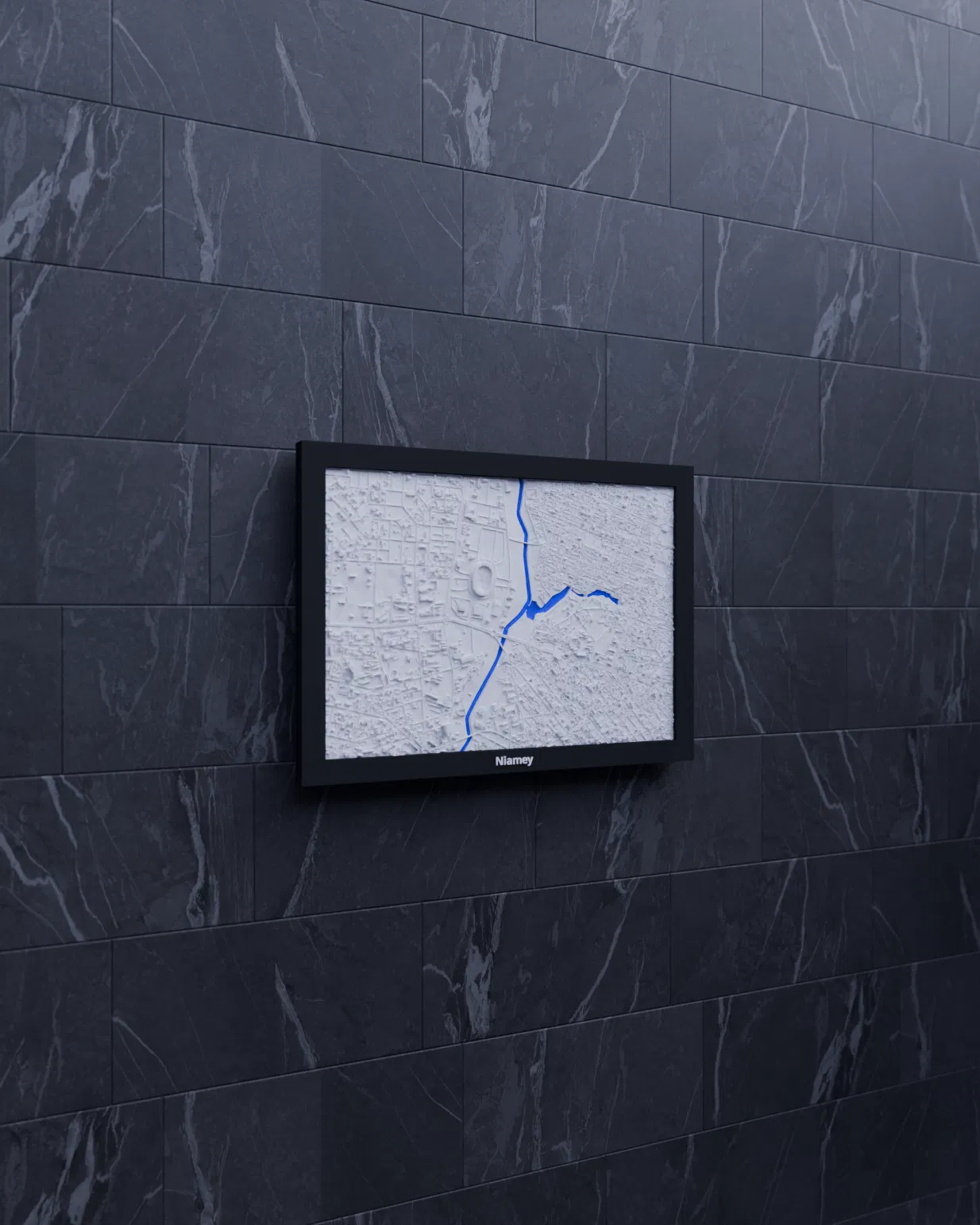 Tái hiện cảnh quan và địa hình Niamey (Niger) bằng mô hình topographic 3D in được. Thu nhỏ từ khu vực 2.814 × 1.960 km xuống 170.5 × 119.5 mm, tỷ lệ khoảng ~16503:1; có frame kèm lỗ treo.