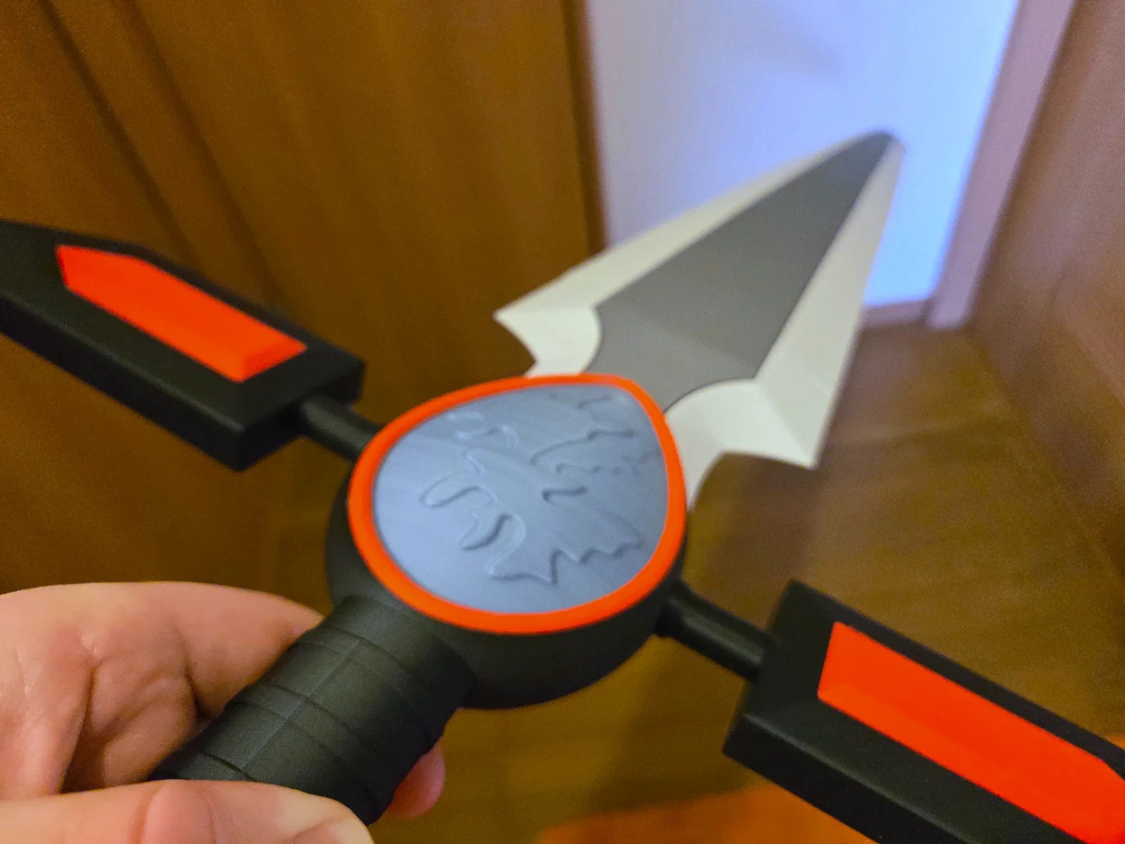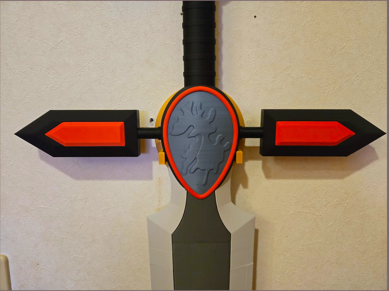 Phần này tốn thời gian hơn mình dự tính ban đầu… Mình dựng bản đầu trong khoảng hai tuần, rồi chỉ sau khi in nguyên cây ra xong, mình mới tìm được box art bản Nhật với góc nhìn “rõ mồn một” đúng profile của thanh kiếm chính thức. Thế là mình phải mất thêm một tuần để chỉnh lại cho đẹp hơn và chắc chắn hơn nhiều. Mình in lại toàn bộ bằng màu trắng để kiểm tra, rồi vẫn phải chỉnh thêm vài chỗ ở thiết kế của một số chi tiết để lắp ráp cho ổn.