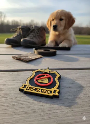 Huy Hiệu Poo Patrol – mẫu huy hiệu vui nhộn cho “anh hùng” khu phố chuyên nhắc mọi người dọn phân chó. Thiết kế lắp ráp, có 2 phiên bản (có/không torus), in PLA nhanh dưới 60 phút, dùng AMS.