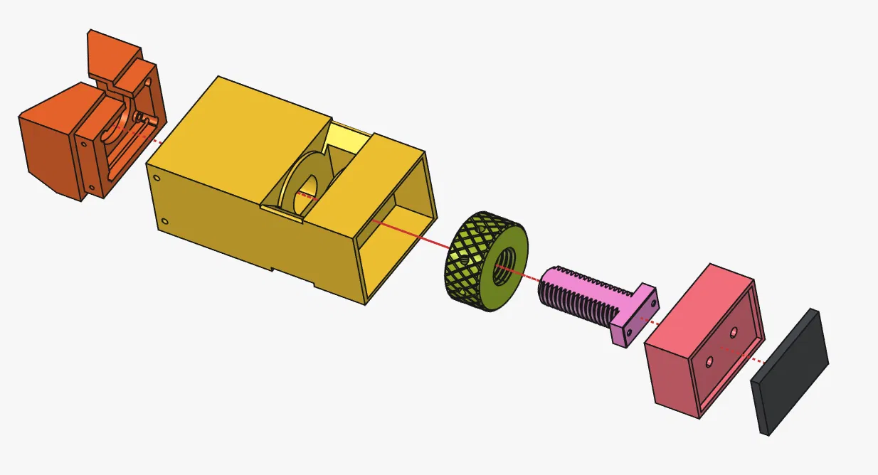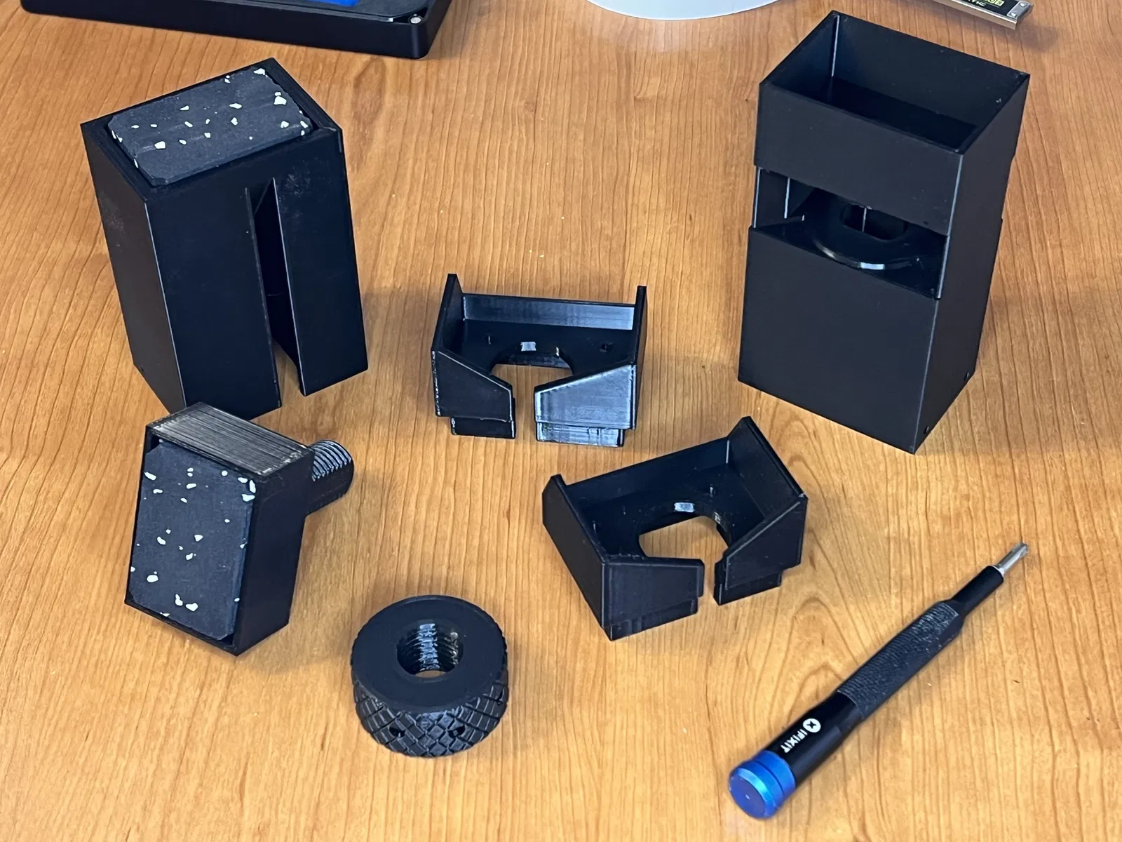 Để tăng độ bám và bảo vệ chân bàn, các bề mặt tiếp xúc dùng miếng cao su dày 5 mm (rubber blocks/dowels). Phần này không in 3D và đóng vai trò là bề mặt đàn hồi, ma sát cao giúp bộ gá đứng chắc mà không để lại vết.