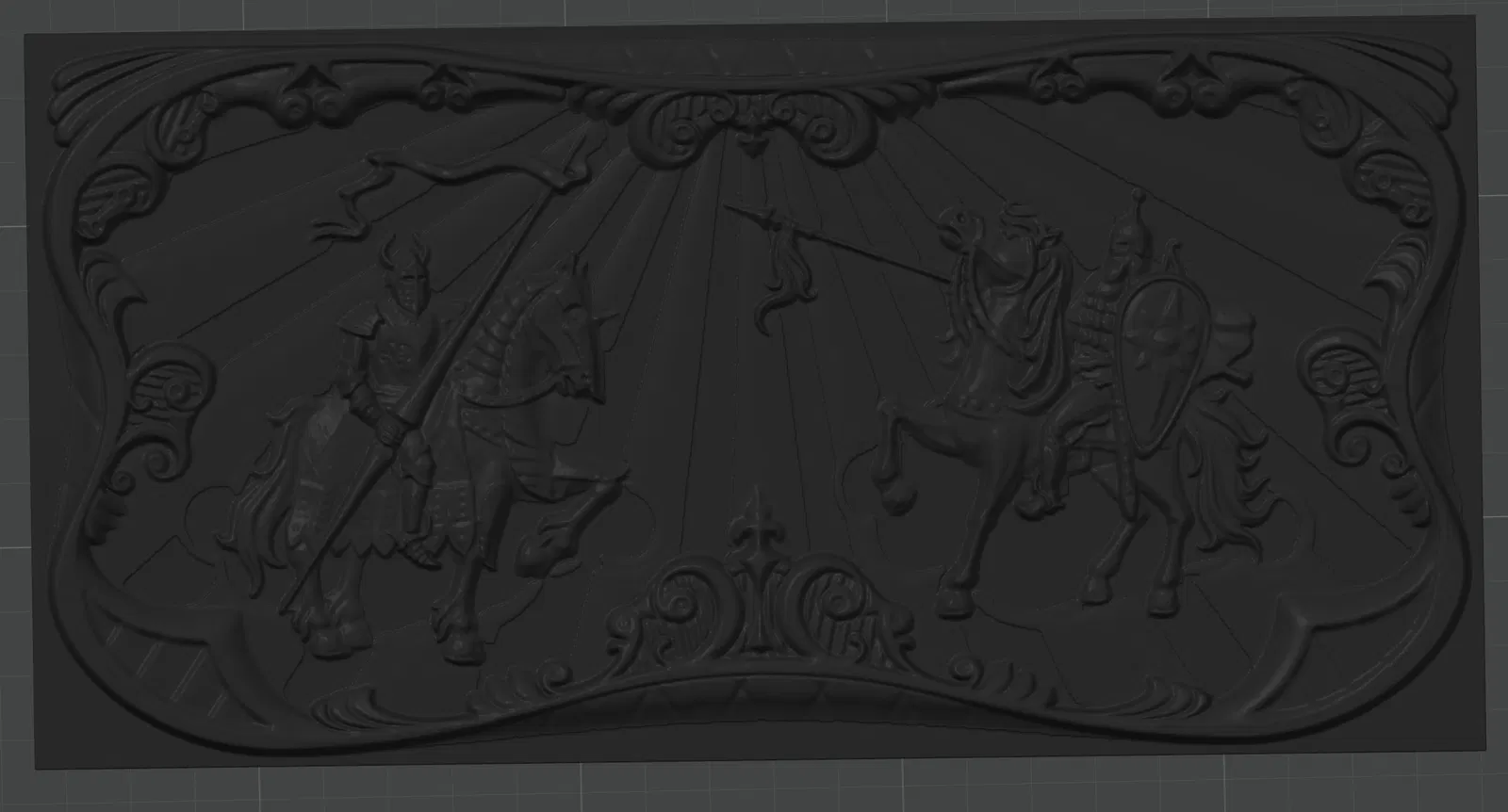 Relief chi tiết mô tả hai hiệp sĩ cưỡi ngựa đối đầu trong tournament hoặc trận chiến. Bản remix từ mẫu CNC miễn phí trên Thingiverse, đã được sửa mesh và tối ưu để 3D printing; hiện chưa print thử.