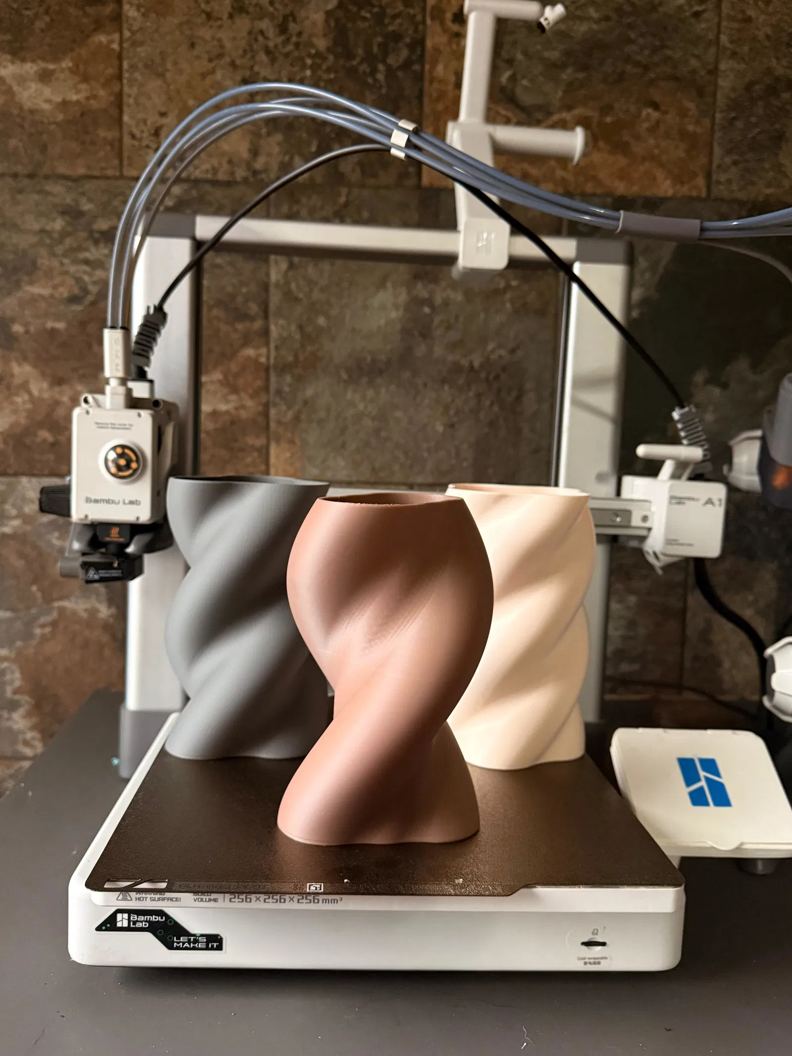 Bộ sưu tập bình Twisted Organic với 3 biến thể Double/Triple/Quad, dáng xoắn hữu cơ theo trục đứng. Có thể in standard để thành dày hoặc vase mode để nhẹ, trang trí; bề mặt xoắn giúp lớp in mượt hơn.