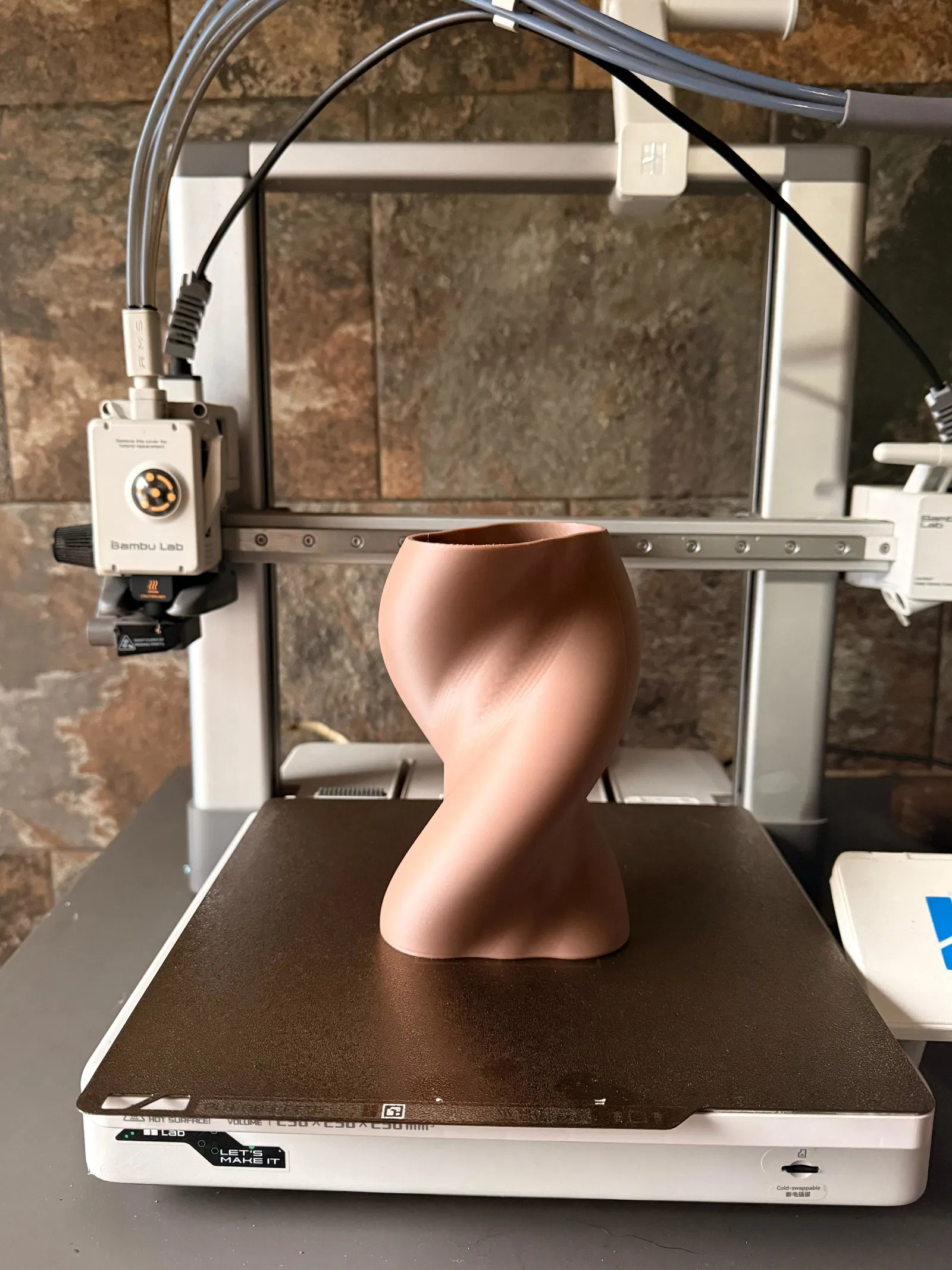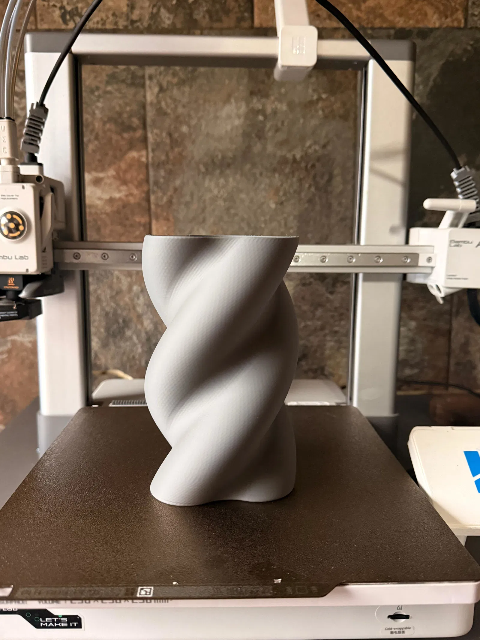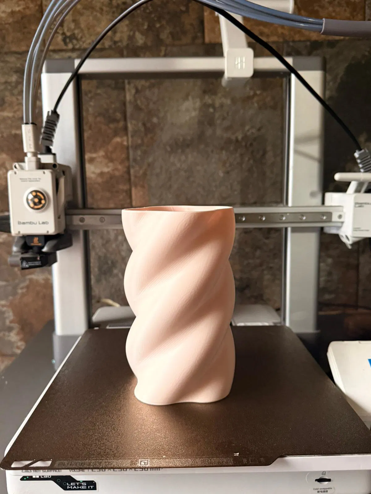 Bình có thể in ở chế độ standard để thành dày hơn, hoặc in vase mode để ra bản nhẹ, thiên về trang trí. Thiết kế xoắn ốc giúp bề mặt nhìn đẹp hơn và làm dịu các vệt chuyển lớp (layer transitions) trong quá trình in.