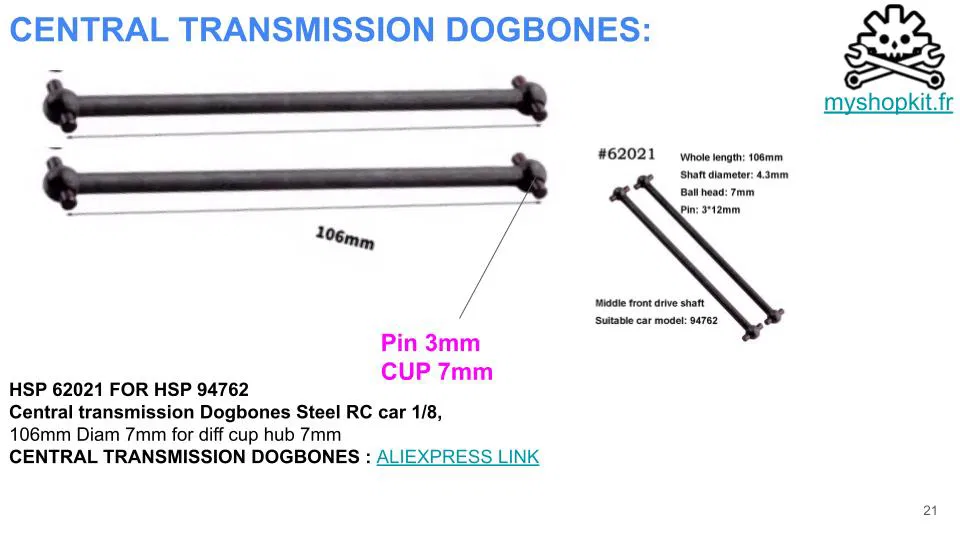 – (X2) Trục truyền dogbones 106mm, cốc 7mm, chốt 3mm (REF: HSP 62021 FOR HSP 94762)