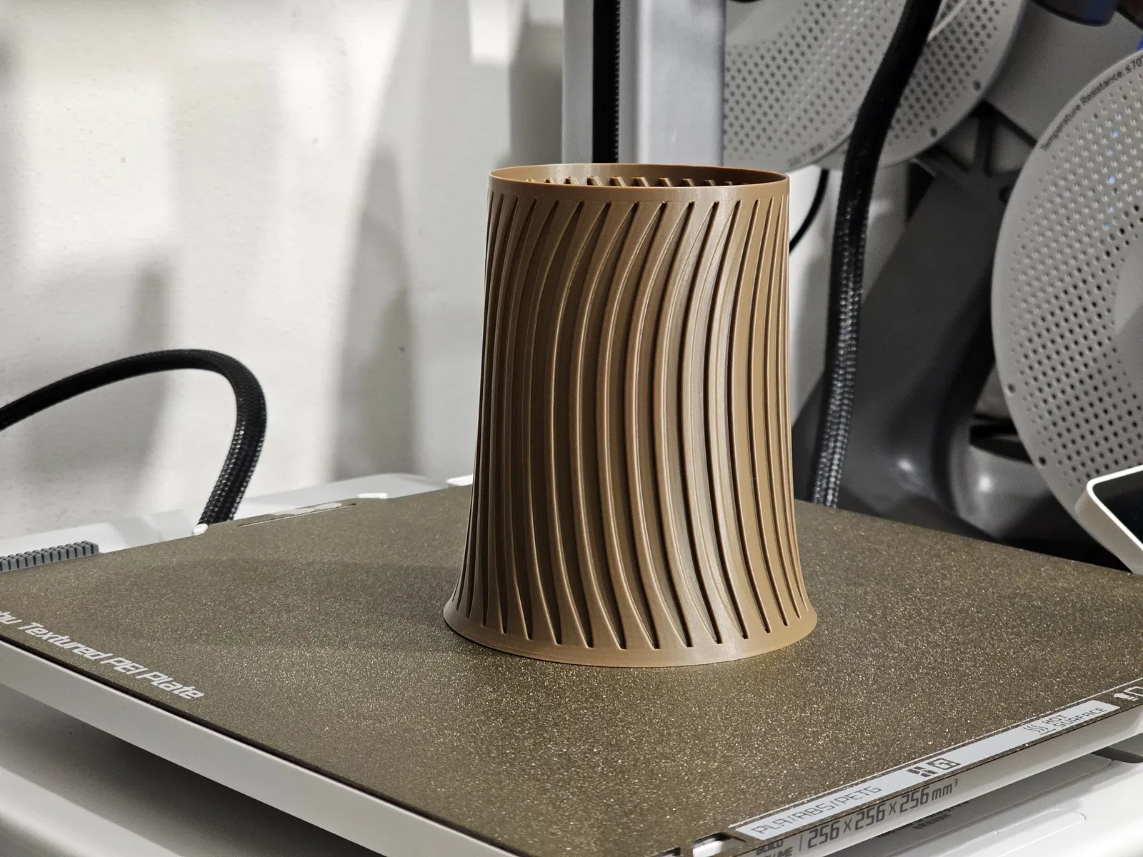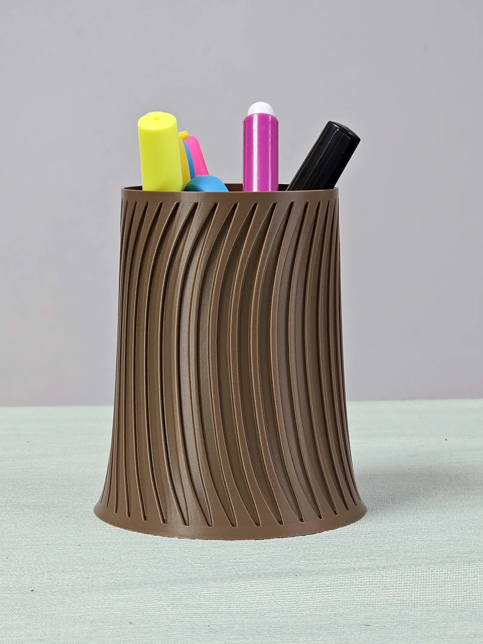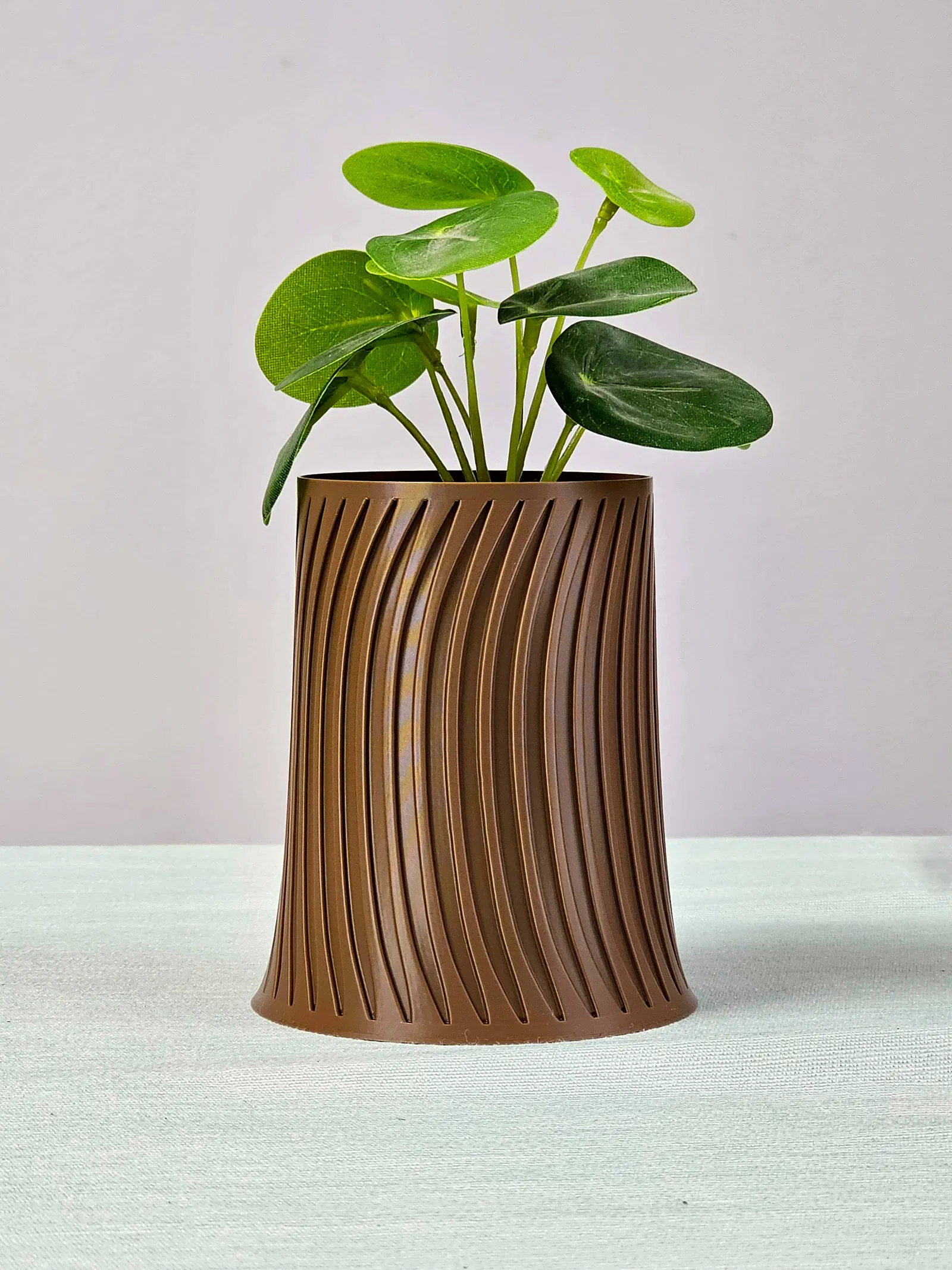 Mẫu 3D zefiro vase với các rãnh uốn lượn tạo hiệu ứng sáng–bóng nổi bật, nhìn hiện đại và sang. Có thể dùng làm ống đựng bút trên bàn hoặc chậu trồng sen đá, cây nhỏ, hợp nhiều không gian.