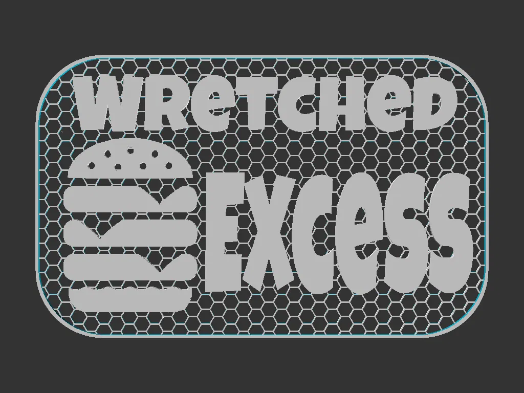 Bảng hiệu 100x160mm với minh hoạ hamburger bị nhồi quá tải và chữ “Wretched Excess”. Có file Mesh và Solid, tối ưu khi color switch trên 1mm (có kèm gcode). Phù hợp lắp Shadowbox Frames.
