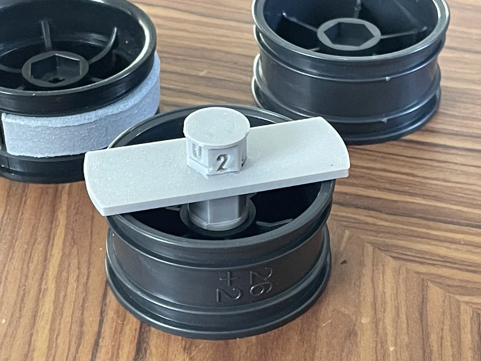 Đây là một cái tool mình ghép lại để so sánh wheel offset cho xe RC drift tỉ lệ 1/10. Cách dùng đơn giản: cắm hết tool vào 12mm wheel hex rồi đẩy phần slider sát vào mép sau của bánh. Vạch mà mép trên của gauge canh đúng sẽ cho biết offset của bánh. Slider được giữ cố định (captured) nên không lo rớt/mất trong hộp đồ nghề, và dải đo từ 0 đến 10mm offset. Xem hình để thấy ví dụ với bánh offset +2 và +6.
