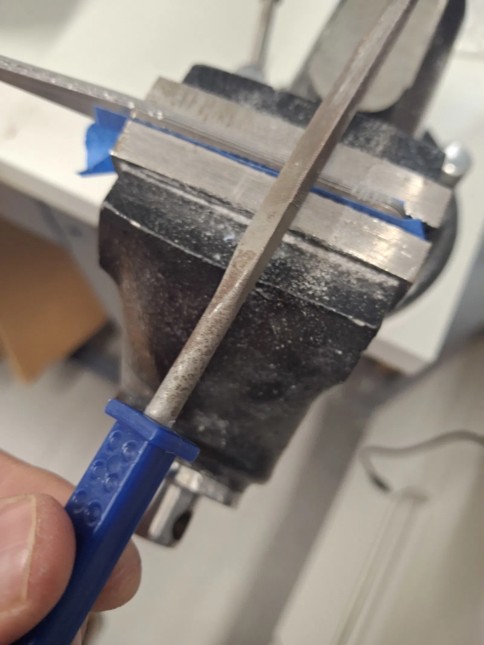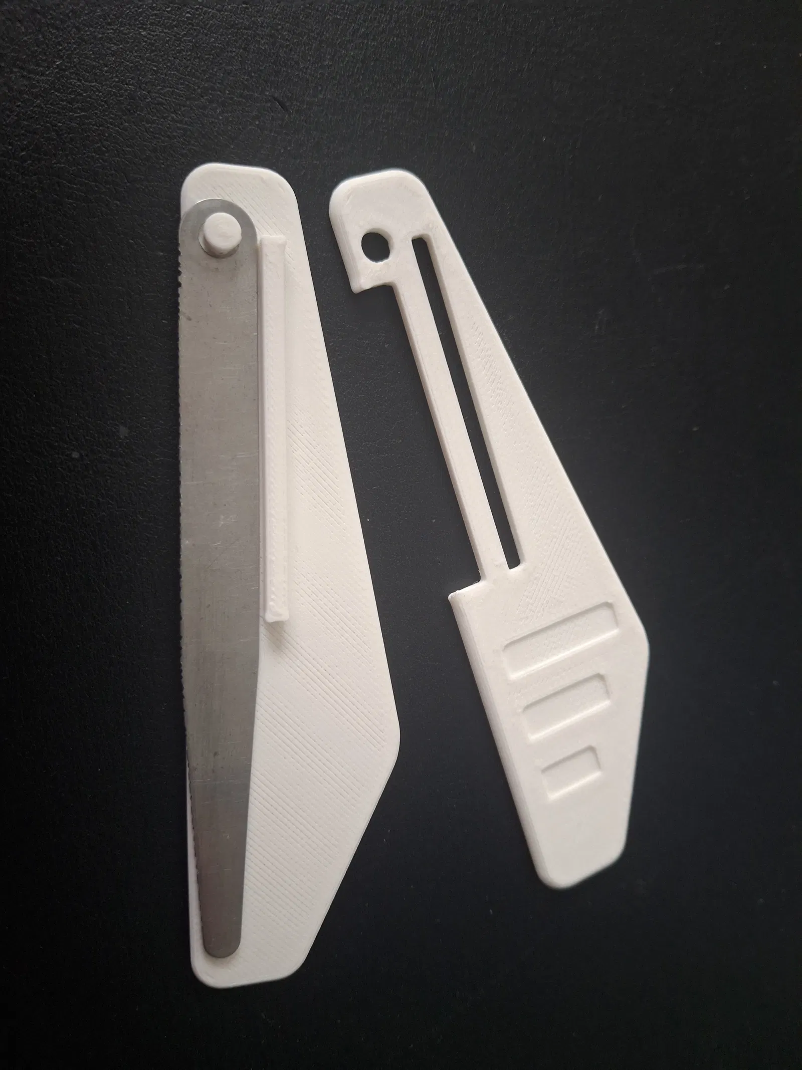 Một bộ feeler gauge tiêu chuẩn (100 × 10 mm, có lỗ khoảng 5 mm), giá chỉ vài euro, có thể biến thành nut file dùng được bằng cách dùng dũa tạo các răng nhỏ lên lá gauge. Nếu cầm và dùng riêng feeler gauge thì nó quá mềm, khó cầm chắc, dễ bị rung lắc khi dũa. Sự rung này làm khó kiểm soát vết cắt và có thể khiến rãnh lược bị rộng quá, nhất là khi làm với cỡ dây mỏng. Để khắc phục, lá gauge đã chỉnh sửa được lắp vào một tay cầm nhựa in 3D, giúp cố định chắc hơn, cầm nắm thoải mái hơn và đảm bảo đường dũa thẳng, đúng bề rộng rãnh.