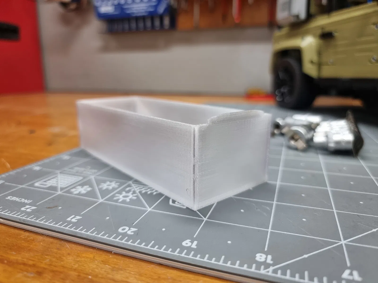 Mình in bằng PETG Translucent. Vì mình dùng 4 wall loops (độ dày vách 2mm) nên ngăn kéo rất chắc, nhưng do vách dày nên sợi translucent nhìn sẽ gần như đục chứ không trong rõ.