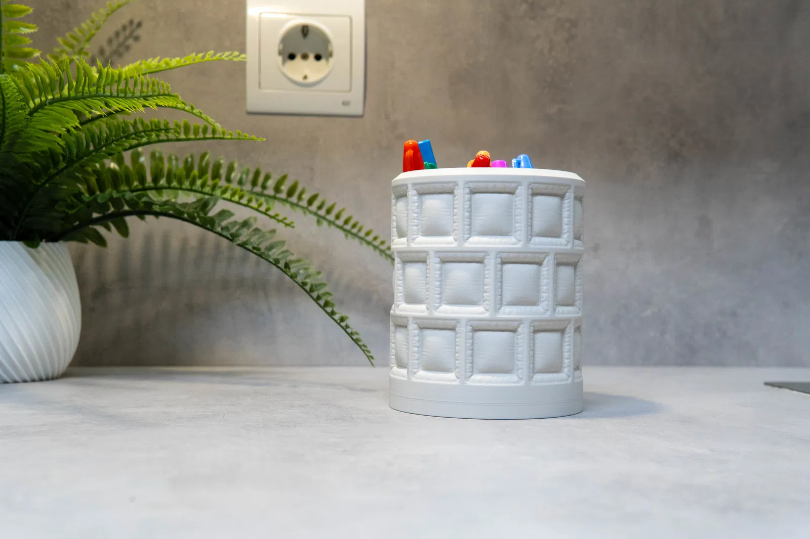 Thiết kế linh hoạt, bạn có thể dùng làm ống đựng bút hoặc làm bình cắm cây mini cho vài nhánh xanh nhỏ. Vẻ ngoài nổi bật nhưng vẫn tối giản giúp mẫu này trở thành điểm nhấn hút mắt cho bàn làm việc, kệ trưng bày hoặc không gian nội thất contemporary.