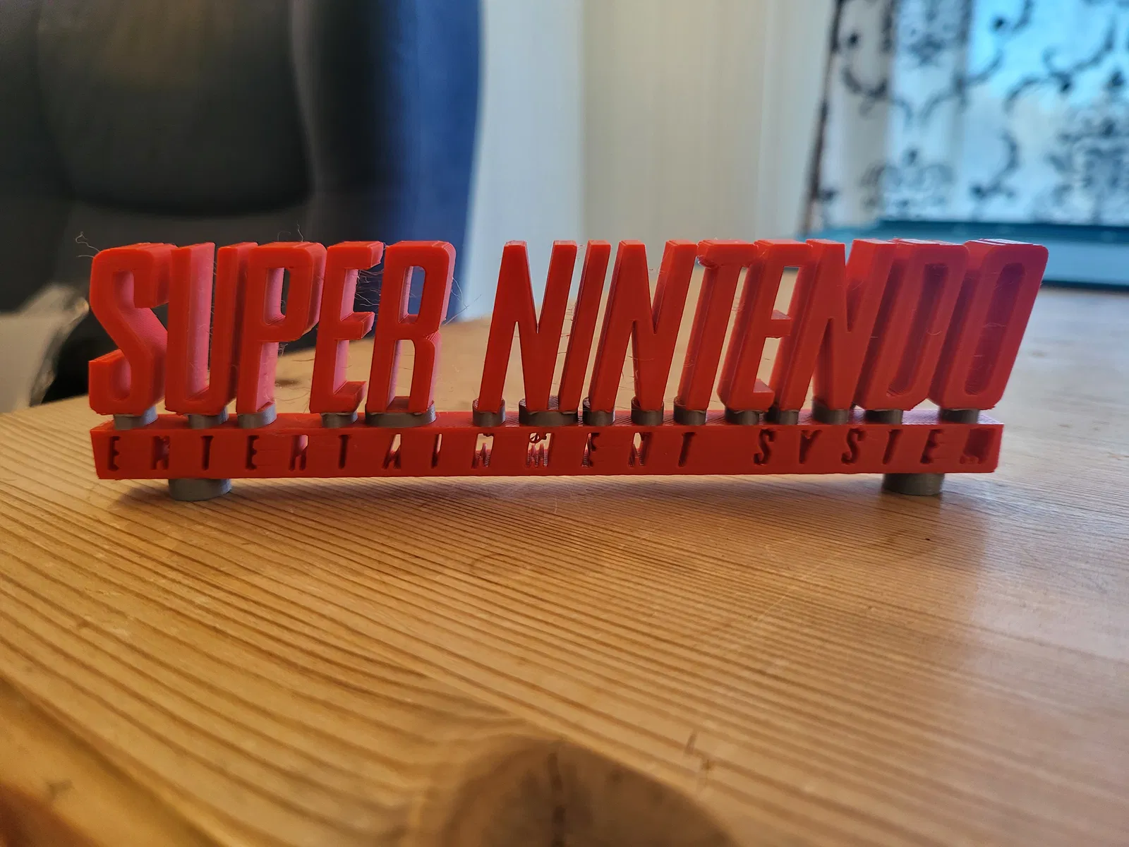 Mẫu trang trí trưng bày logo SNES (Super Nintendo). Có file 3MF pre-coloured cho in multi-colour; in dựng đứng nhiều màu cần supports, còn in 1 màu chỉ cần đặt nằm phẳng là không cần supports.