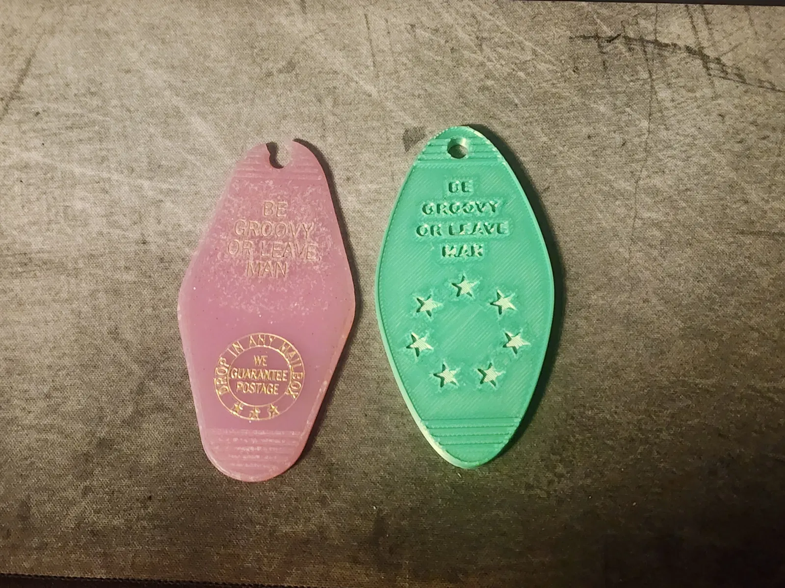 Móc khóa "be groovy" này mình làm như một phiên bản “spiritual successor” cho chiếc móc khóa của bạn mình bị gãy. Mình cố giữ lại tổng thể dáng vẻ của bản gốc, nhưng chỉnh lại để tránh các chi tiết quá mảnh và in bằng màu bạn mình thích.