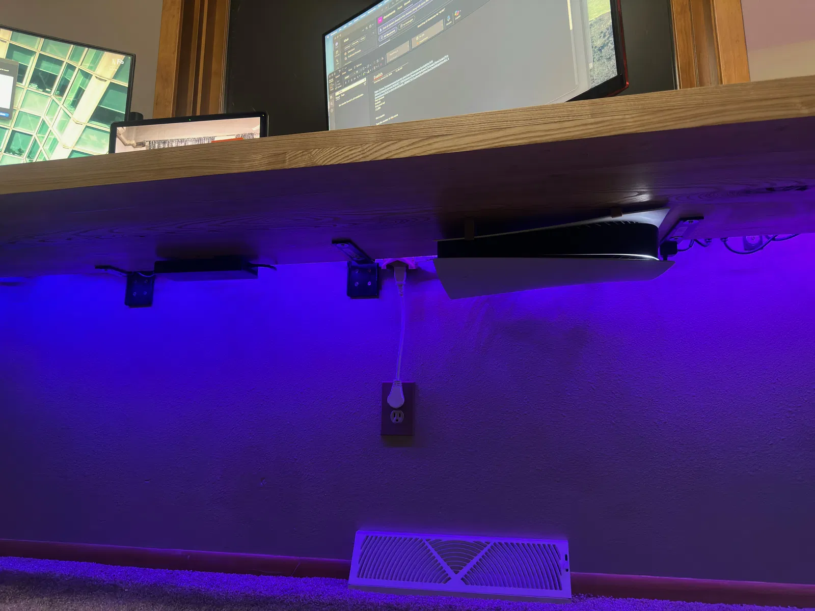 Mẫu giá đỡ PS5 Digital gắn dưới bàn, được chỉnh từ bản gốc: thêm lỗ bắt vít và gia cố phần kẹp giữ chắc hơn. Tác giả in bằng PLA Creality wood filament; khuyến nghị test độ chịu lực trước khi lắp.