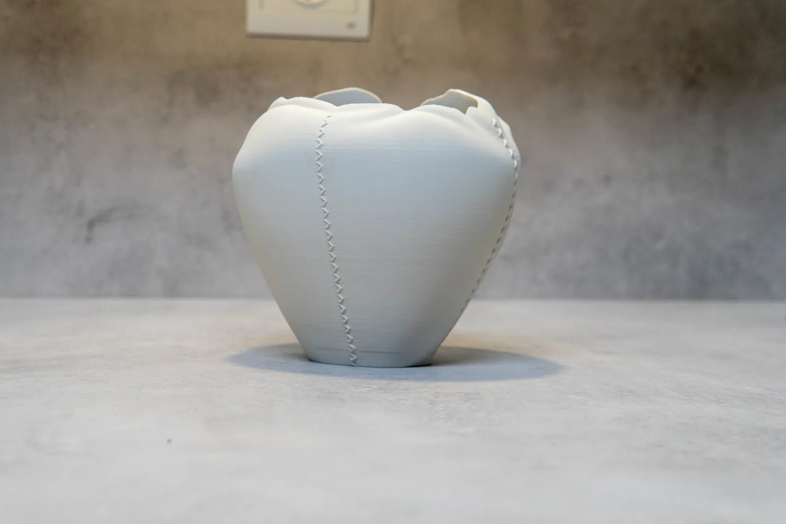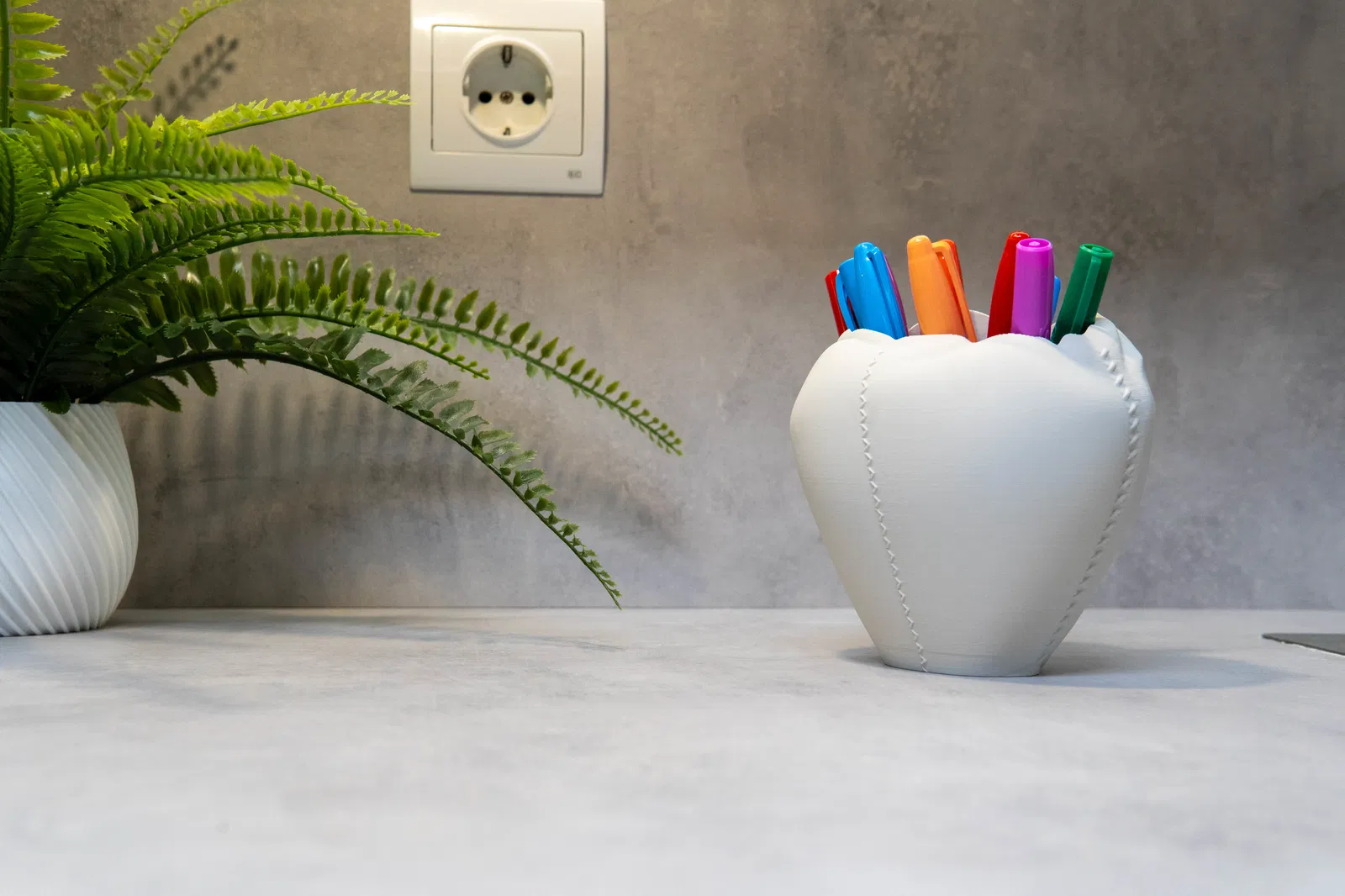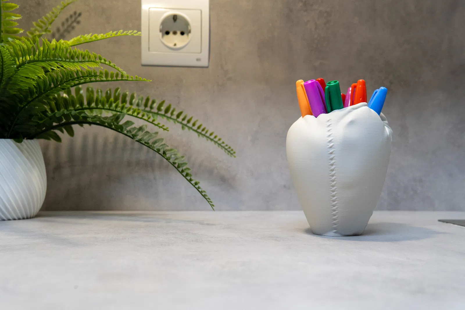 Ống cắm bút hình trái tim kiểu fluffy này có dáng mềm, như được độn bông, với các đường bo tròn và chi tiết đường chỉ may trang trí. Bề mặt phồng tạo cảm giác ấm áp như vải, nhưng tổng thể vẫn giữ được dáng gọn gàng và hiện đại.