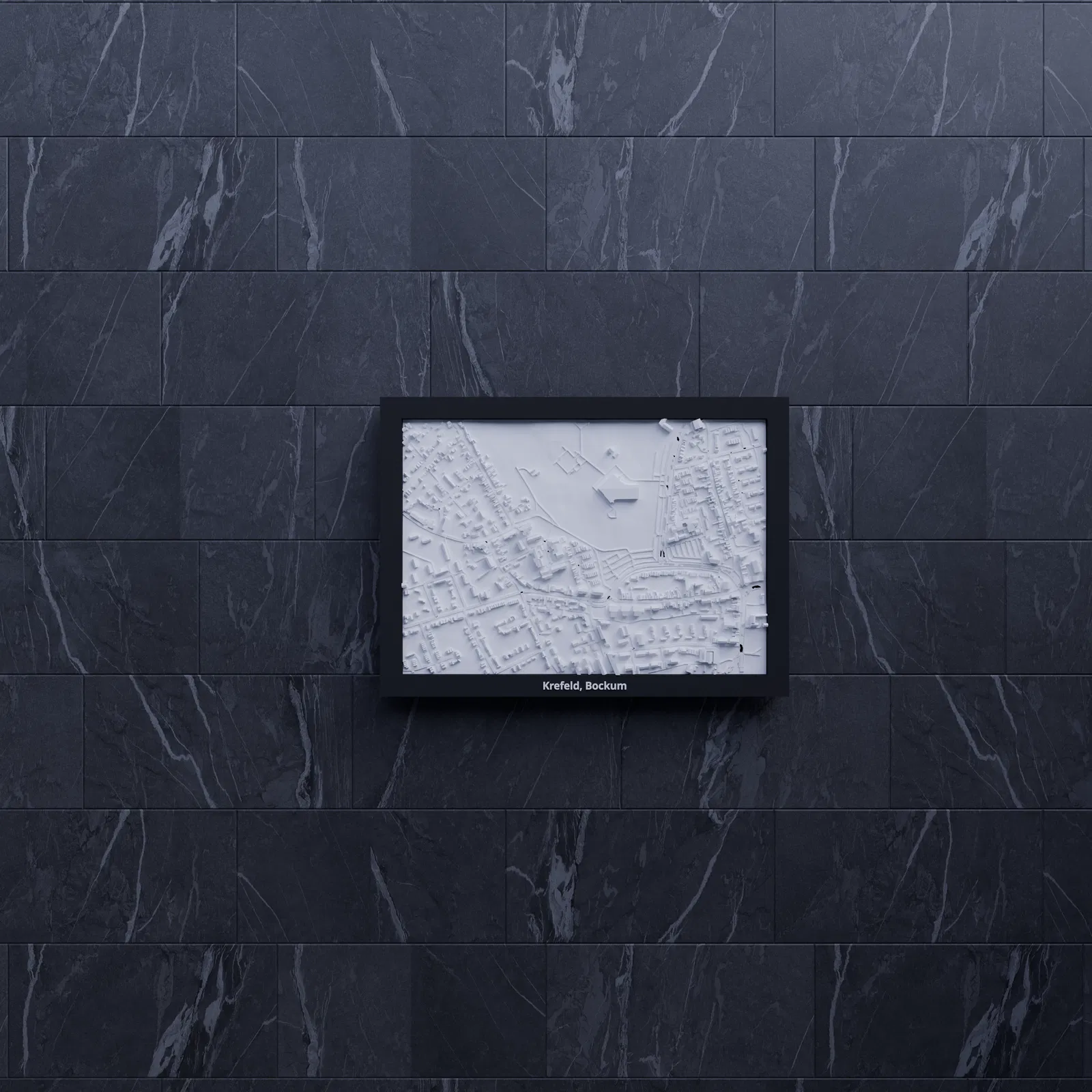 Mô hình địa hình thu nhỏ 3D của Krefeld, Bockum (Đức), dựng từ dữ liệu địa lý thật. Kích thước 170.5 × 119.5 mm, tỷ lệ ~6012:1, có các frame kèm lỗ treo, phù hợp decor hoặc trưng bày.