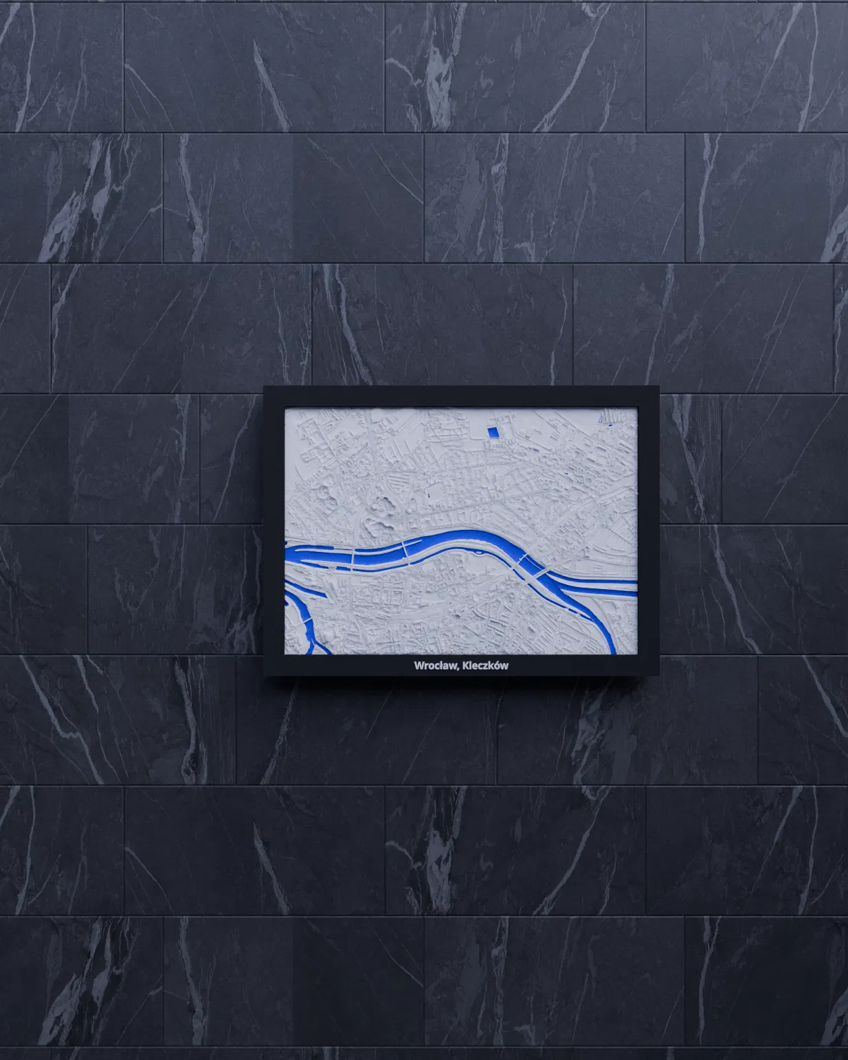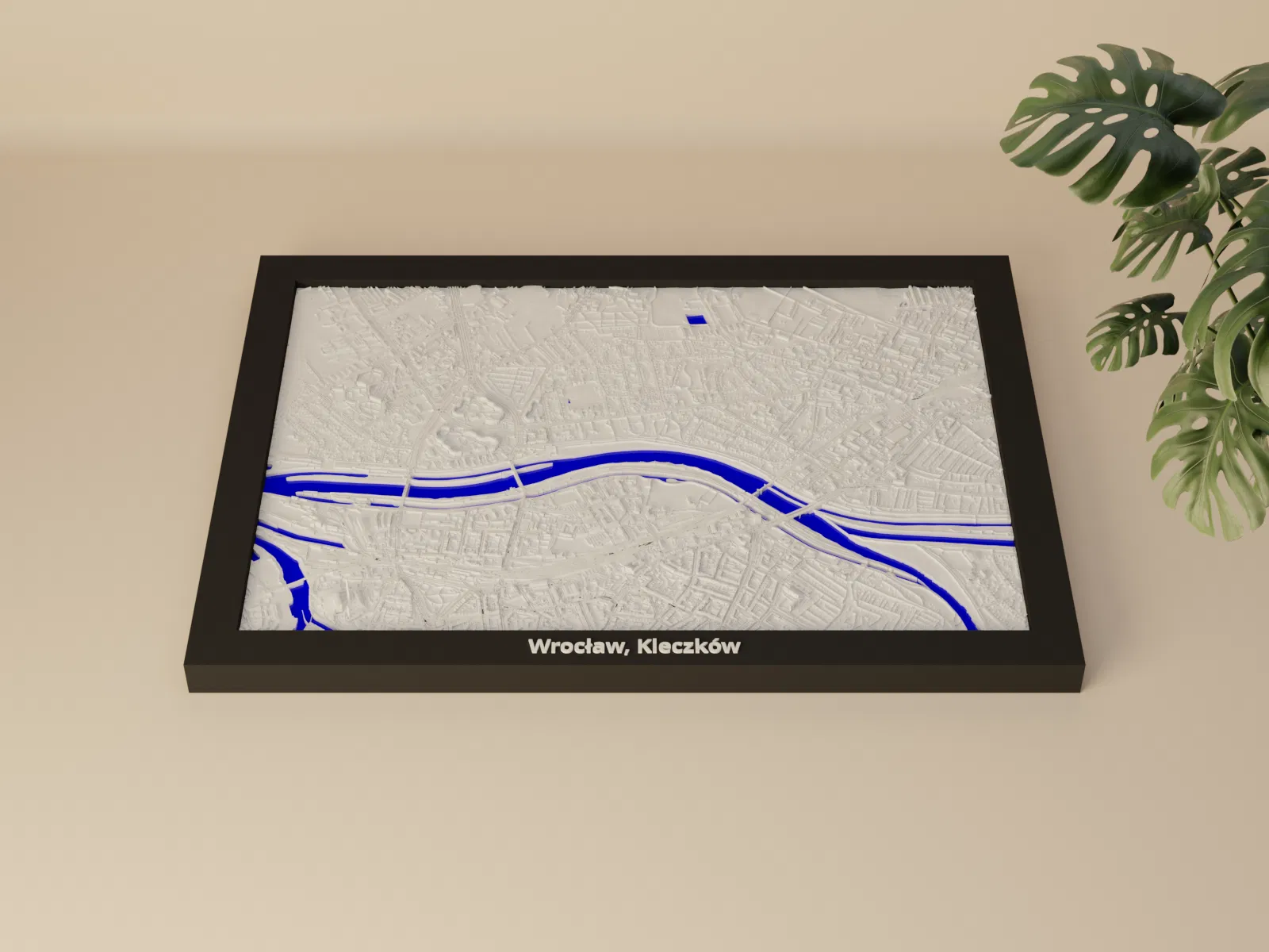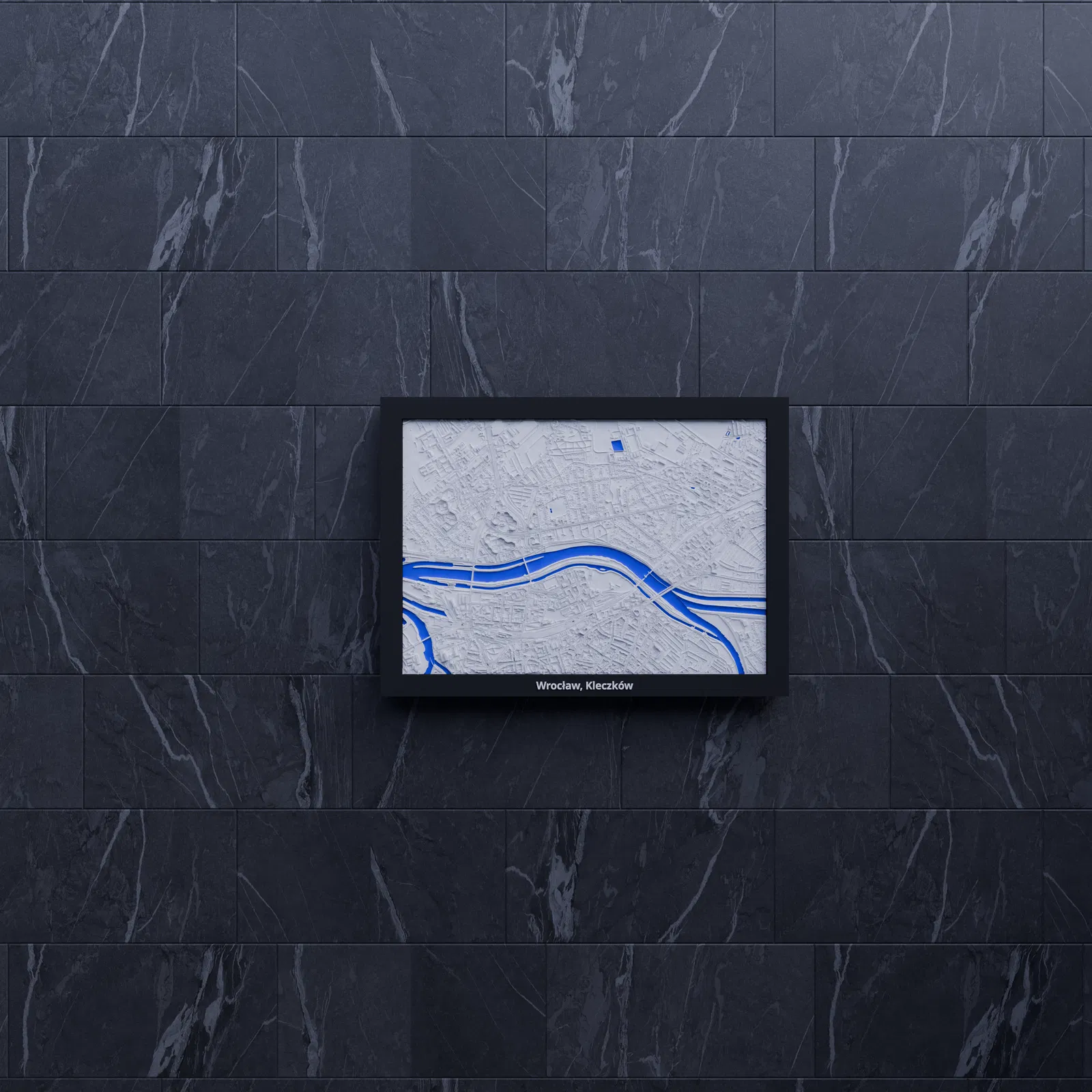 Miniature địa hình in 3D tái hiện khu Wrocław, Kleczków (Ba Lan) từ dữ liệu địa lý, tỷ lệ ~23809:1. Kèm nhiều frame có lỗ treo, hỗ trợ in multicolor hoặc single color, phù hợp trang trí và học tập.