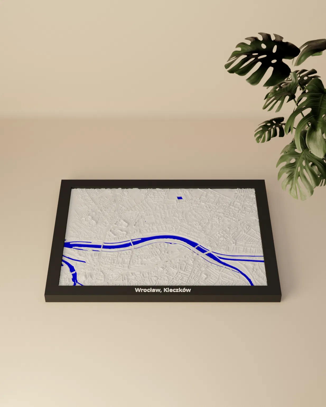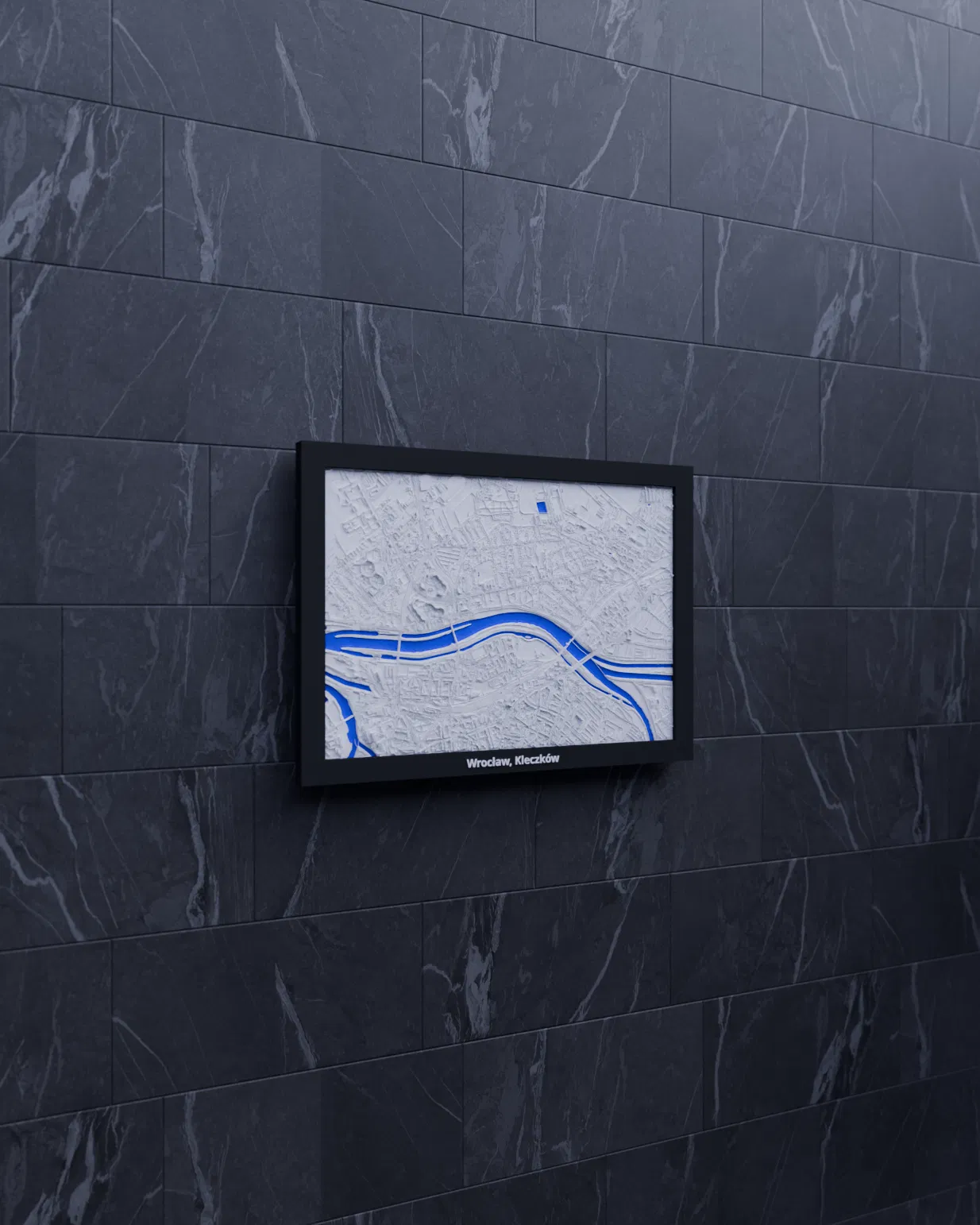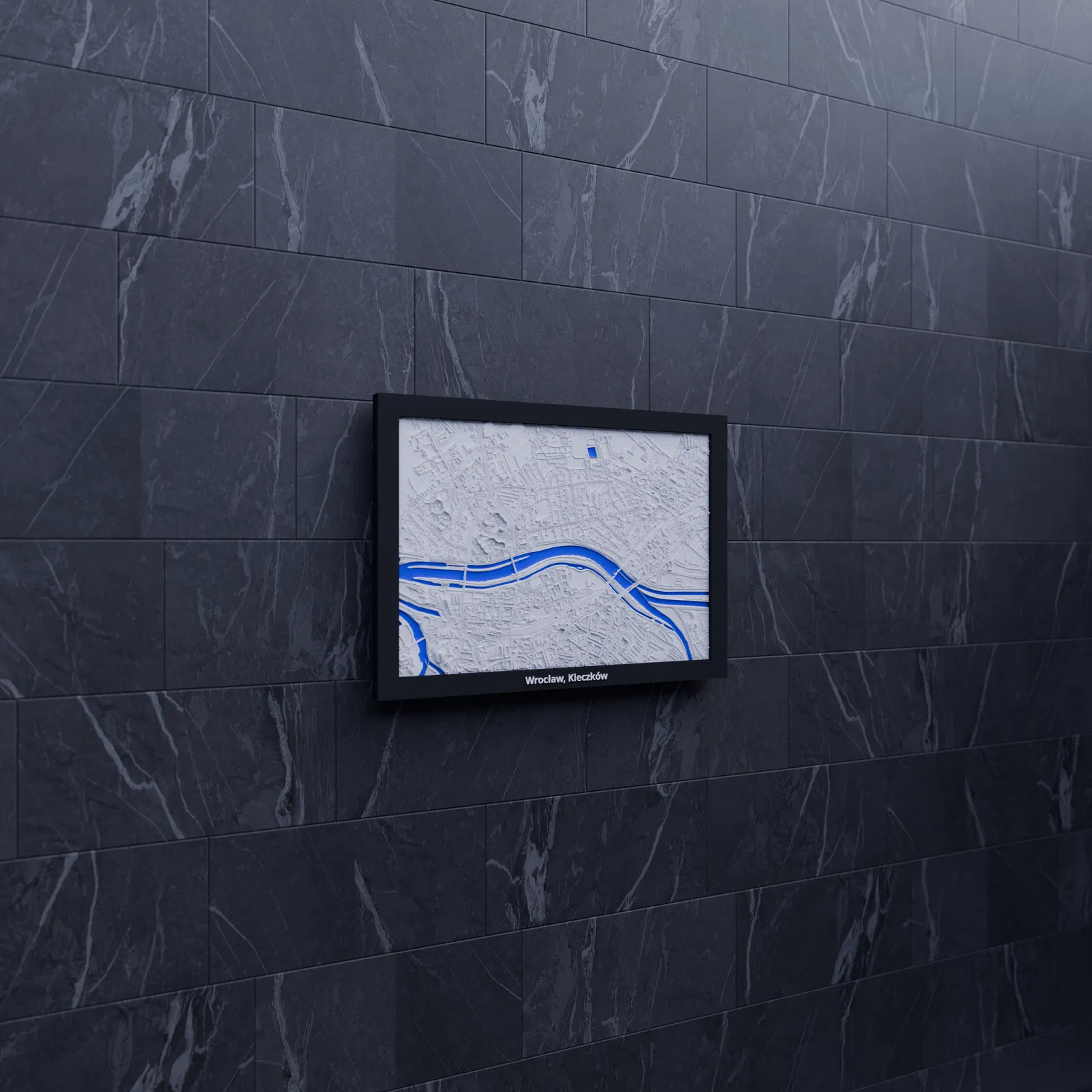 Miniature địa hình in 3D tái hiện khu Wrocław, Kleczków (Ba Lan) từ dữ liệu địa lý, tỷ lệ ~23809:1. Kèm nhiều frame có lỗ treo, hỗ trợ in multicolor hoặc single color, phù hợp trang trí và học tập.