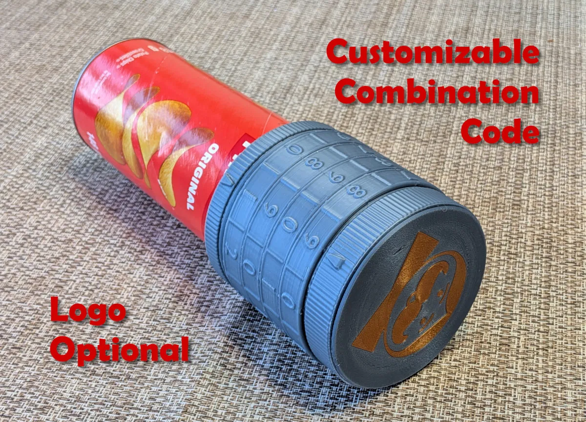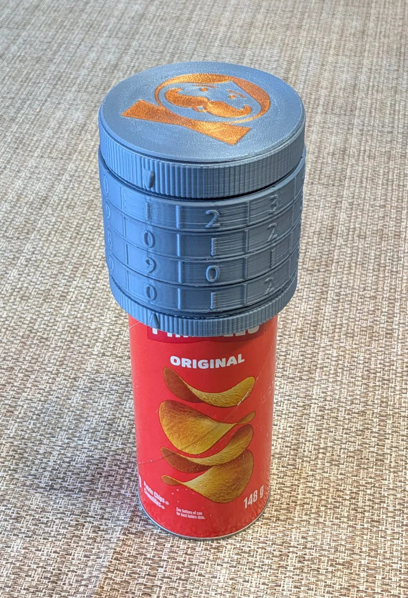 Bảo vệ ống Pringles khỏi ăn vụng với khóa kiểu cryptex 4 vòng. Đổi mã linh hoạt, có vòng chữ và số (vòng chữ chia 3 bộ để dễ ghép từ). Ôm khít ống nhờ lõi Flex-Fit và cơ cấu chặn cơ học.