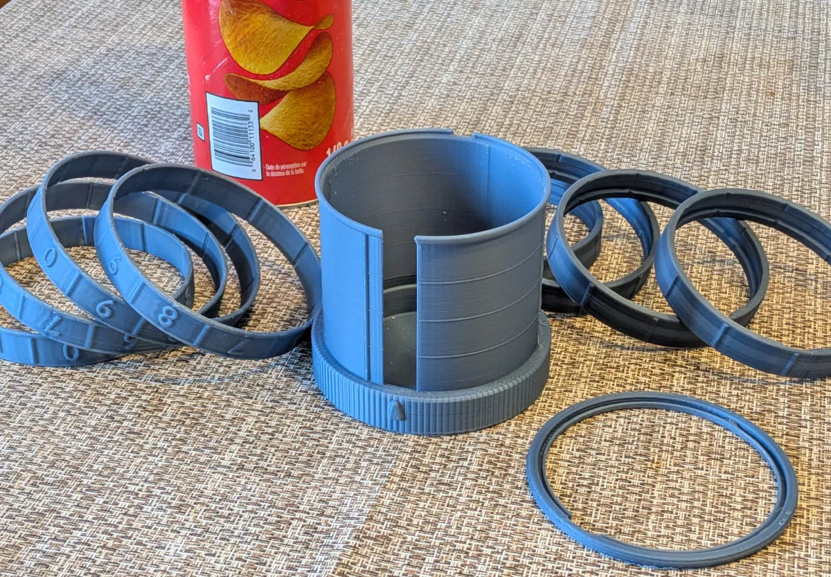 Bảo vệ ống snack của bạn khỏi cảnh “ăn vụng không xin phép” với Pringles Protector. Đây là một khóa kiểu cryptex dùng được thật, ôm khít vừa chuẩn lên ống Pringles tiêu chuẩn. Nhờ cơ cấu chặn cơ học, ống bọc dưới sẽ kẹp lấy phần gờ mép trên của lon, khiến bạn không thể mở ra nếu chưa xoay đúng mã.