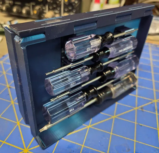 Hộp gập cho torx drivers: vừa cất giữ, mang theo, vừa trưng bày trên bàn. In PLA, dùng PETG filament làm chốt bản lề, nắp gập 180° để lấy dụng cụ nhanh và gọn gàng.