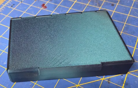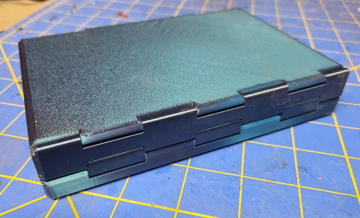 Dùng PETG filament làm chốt bản lề (hinge pins), còn phần hộp in bằng PLA, nên hộp này vừa lo phần lưu trữ vừa trưng bày. Nắp hộp có thể gập 180 độ.