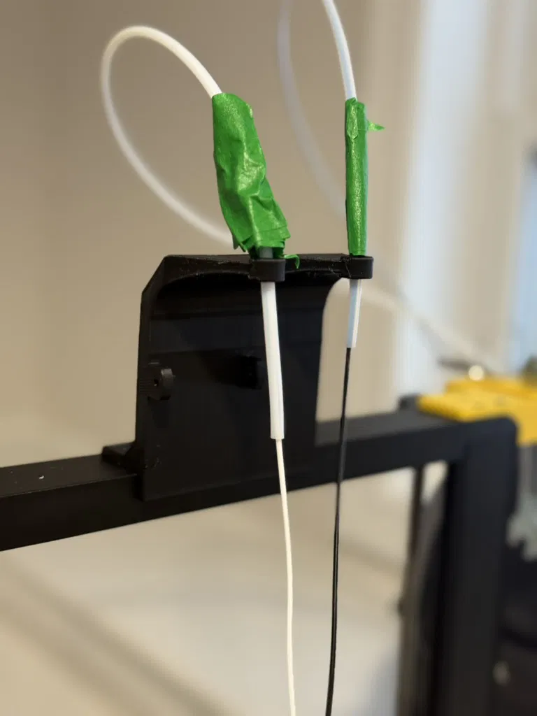 Filament guide giúp dẫn cùng lúc 2 sợi filament để nạp (loading) dễ hơn trên Ender 3 V3 SE/KE. Khi lắp, bắt vít vào 2 lỗ ở giữa và in kèm supports để đảm bảo độ ổn định.