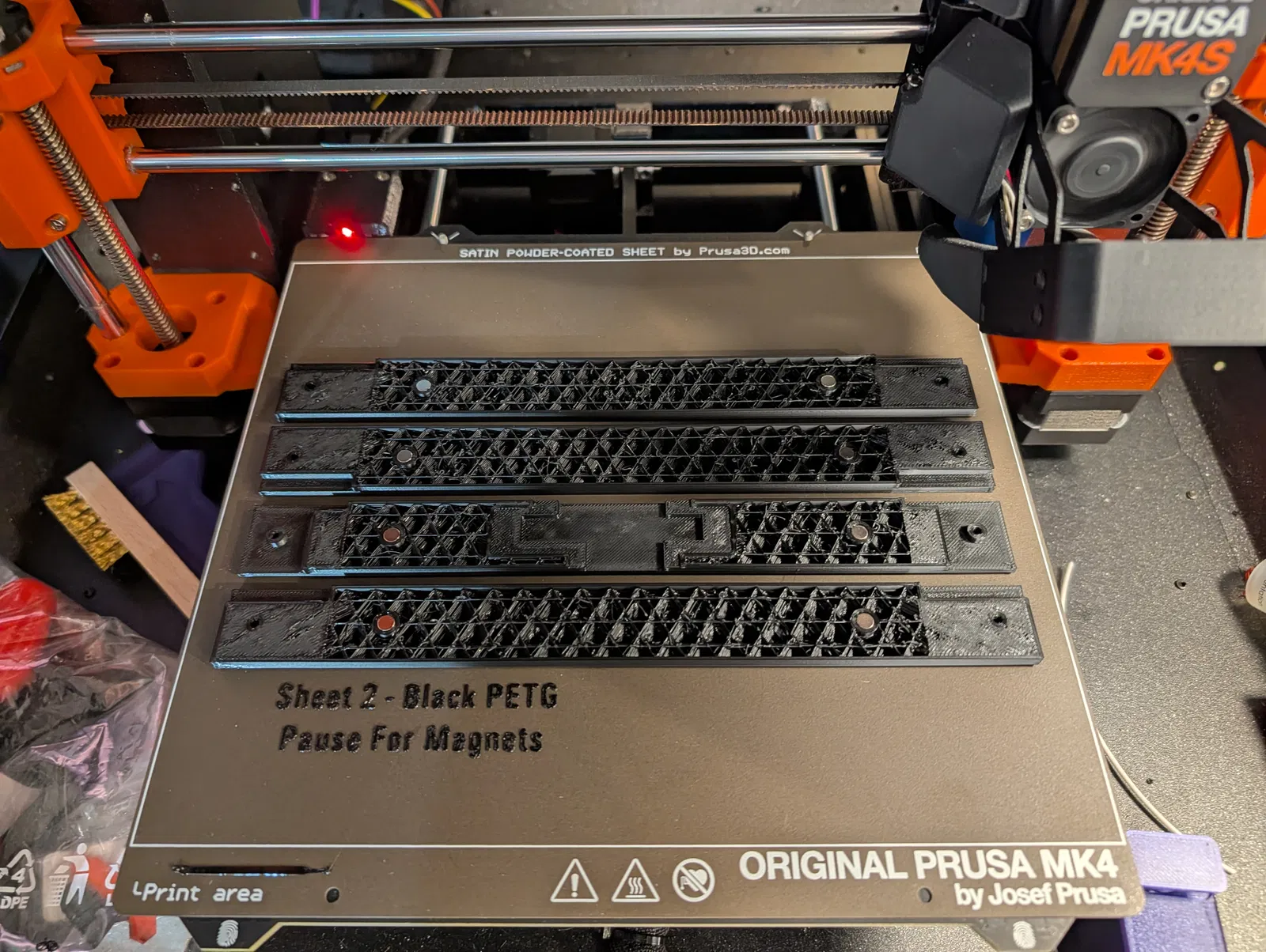 Vẫn dùng nam châm 5x5mm giống bản gốc, nhưng mình muốn embed nam châm thẳng vào chi tiết in để chắc chắn là không bao giờ bị rơi ra ngoài ngoài ý muốn. Nam châm có độ khít hơi lỏng hơn bản gốc, nên lúc pause in thì nam châm sẽ dễ trượt vào đúng phần rãnh của nó. Bạn nên chèn nam châm ở lần tạm dừng ngay sau lớp tại z-height 5.4mm (nam châm cao 5mm + lớp đáy 0.2mm + dung sai 0.2mm). Với bản mình in ở layer height 0.2mm (xem file bgcode đính kèm), điểm pause sẽ rơi vào layer 5.6mm (PrusaSlicer sẽ đặt pause ngay trước khi in layer mà nó đang nằm trên đó).