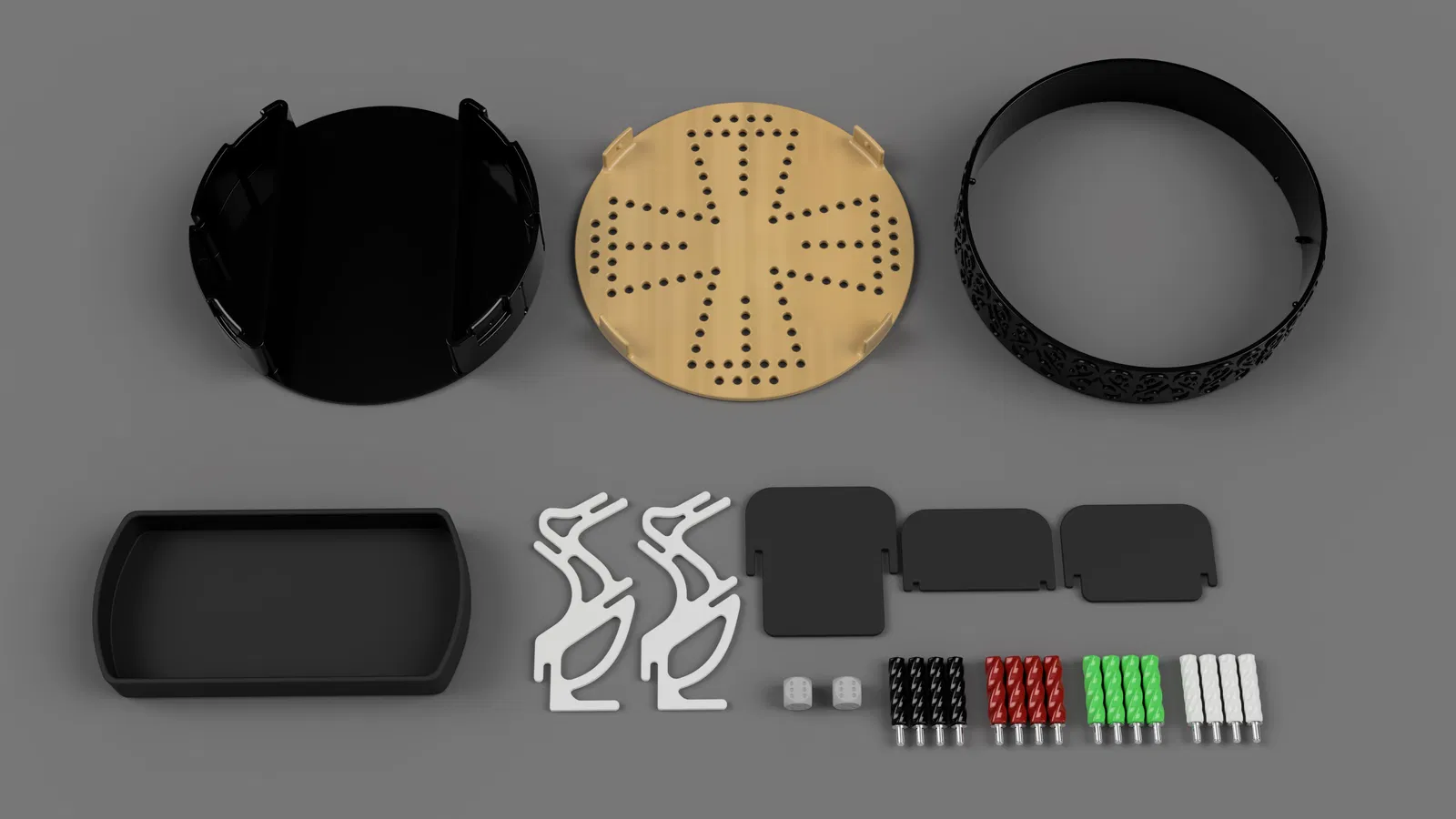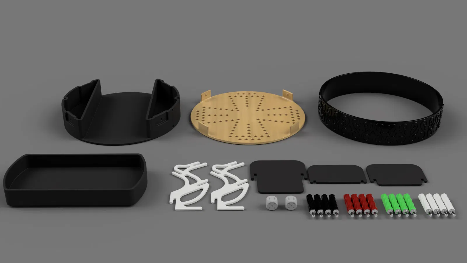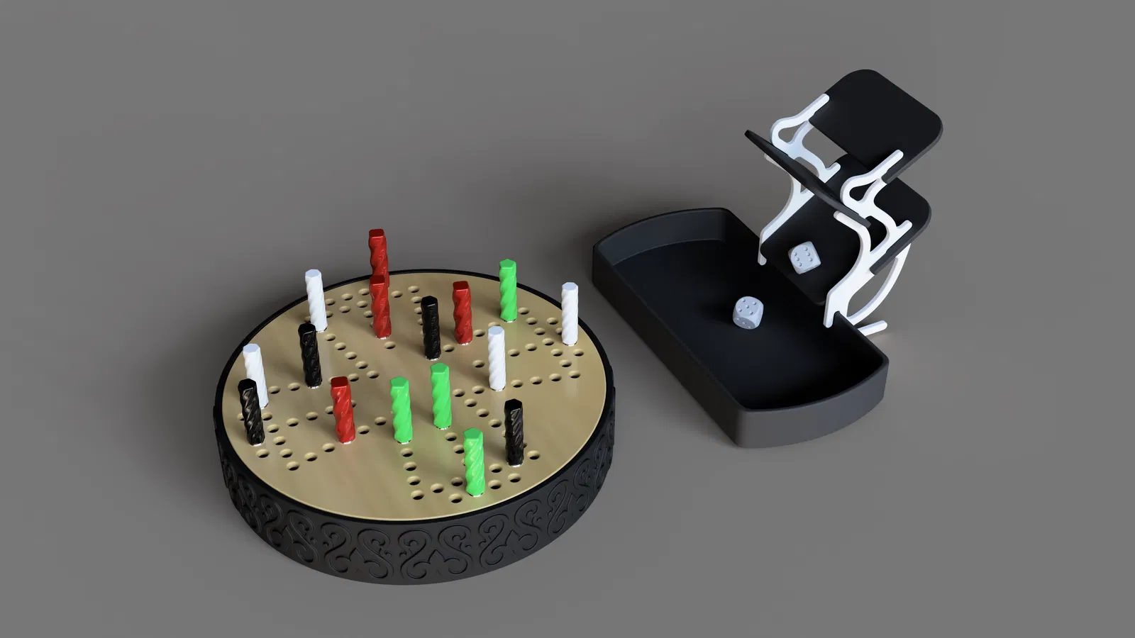 Bộ Ludo (Shesh-Besh) du lịch all-in-one portable cho 2–4 người chơi, đường kính 200mm. Có ngăn kéo trượt giấu quân cờ và tháp xúc xắc gấp gọn, snap-fit chắc chắn, in FDM không cần supports.