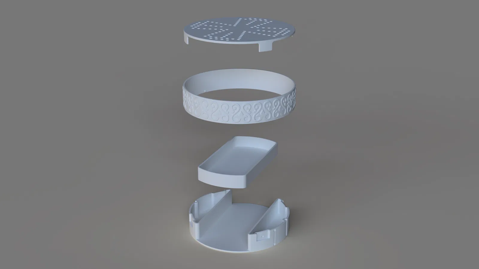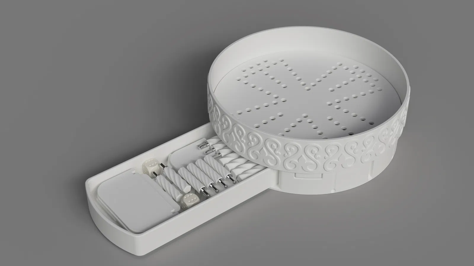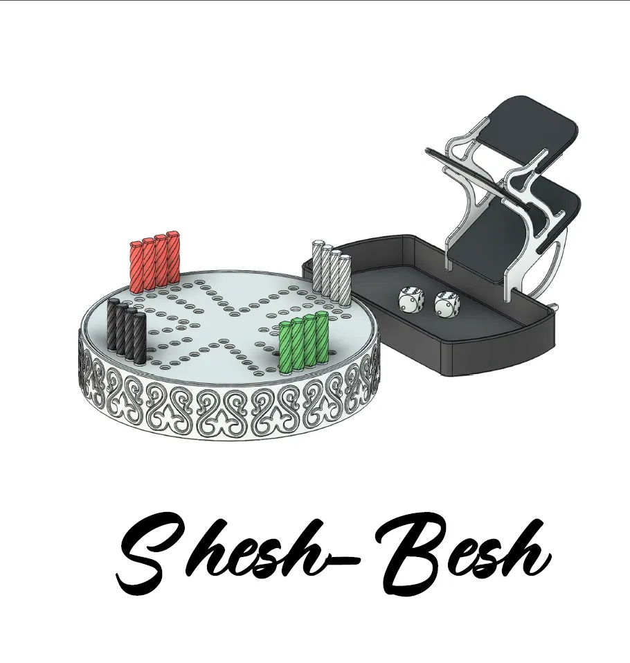 Bộ Ludo (Shesh-Besh) du lịch all-in-one portable cho 2–4 người chơi, đường kính 200mm. Có ngăn kéo trượt giấu quân cờ và tháp xúc xắc gấp gọn, snap-fit chắc chắn, in FDM không cần supports.