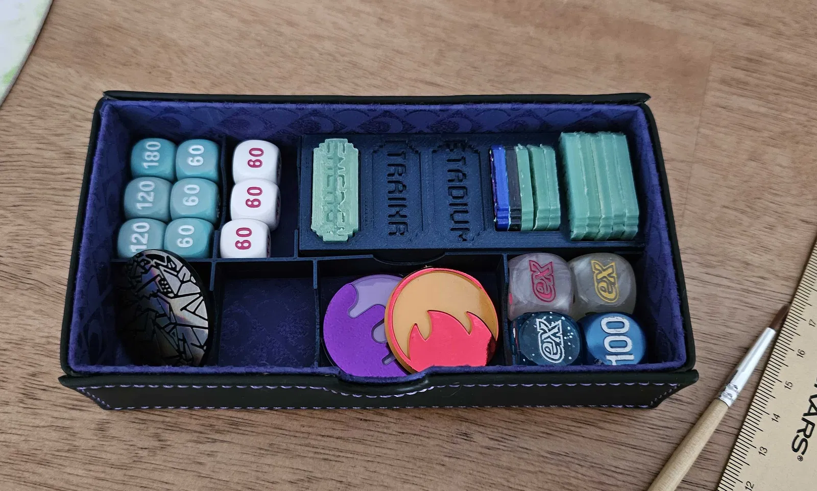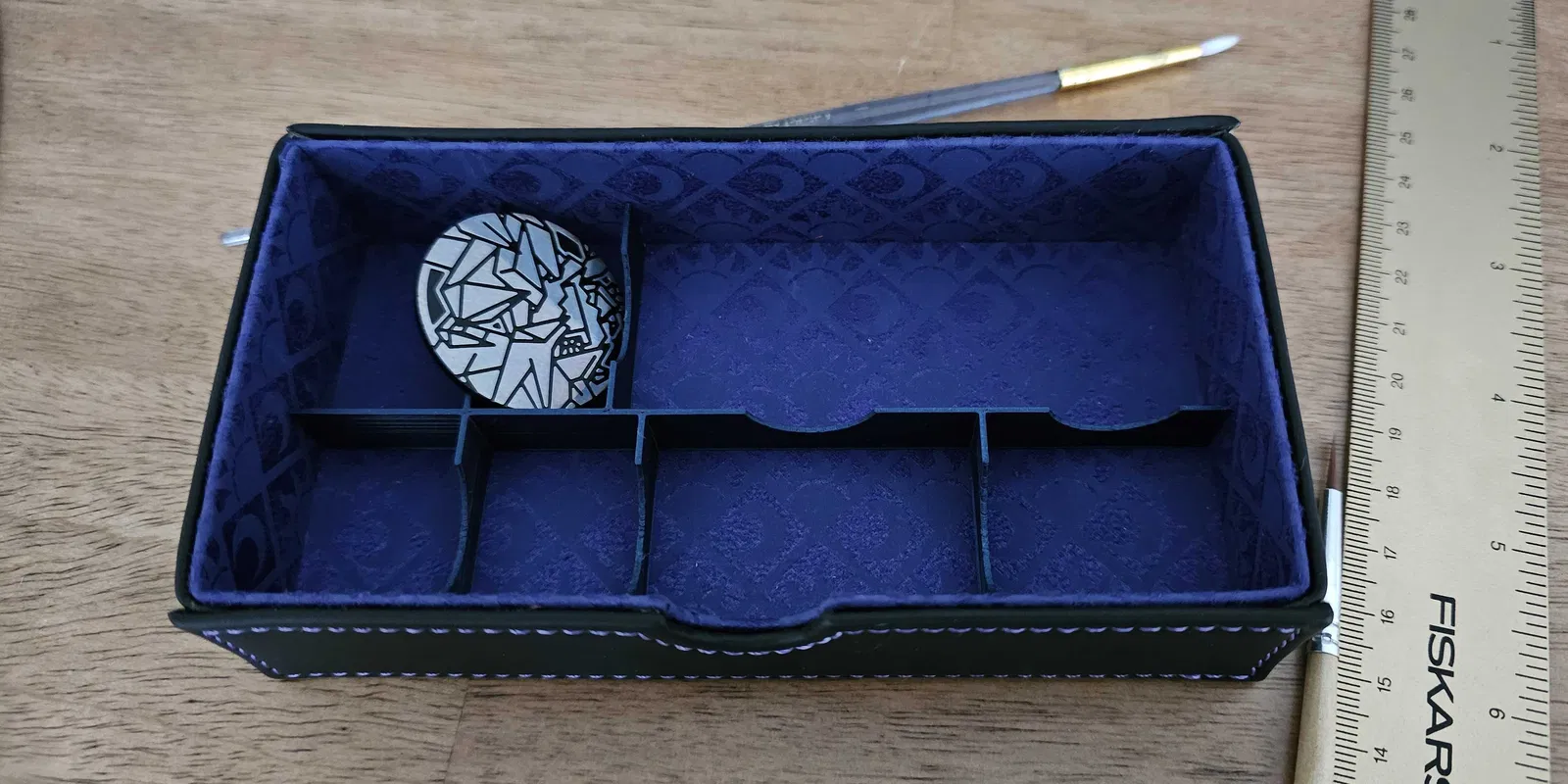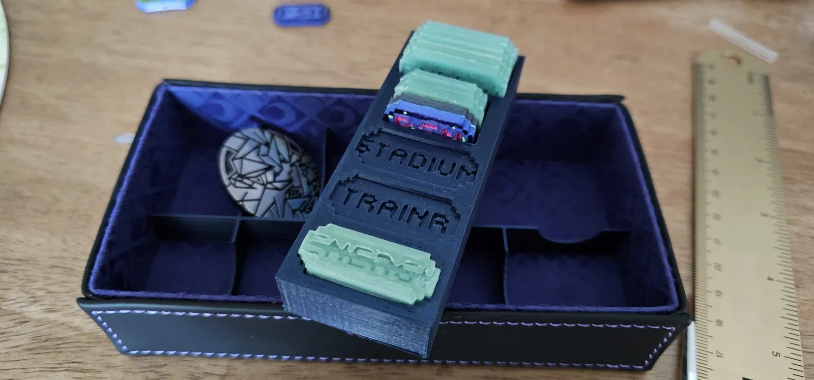 Phần organizer này được canh kích thước để nhét vừa gần như hoàn hảo vào hộp dual-deck Umbreon/Espeon chính hãng bán bởi Pokemon Center. Ngoài khay chip, bạn cũng có thể dùng để đựng xúc xắc, xu, v.v.