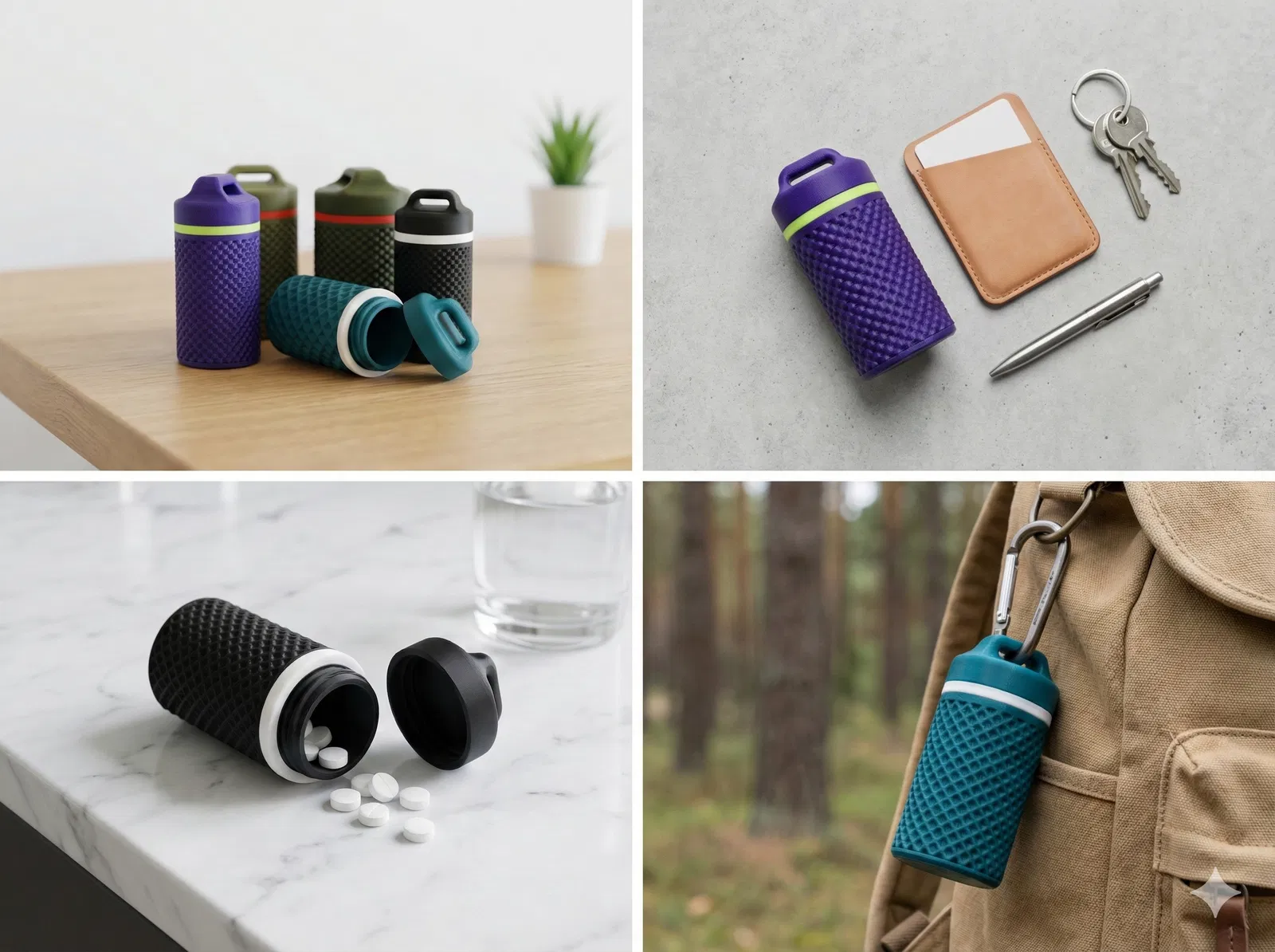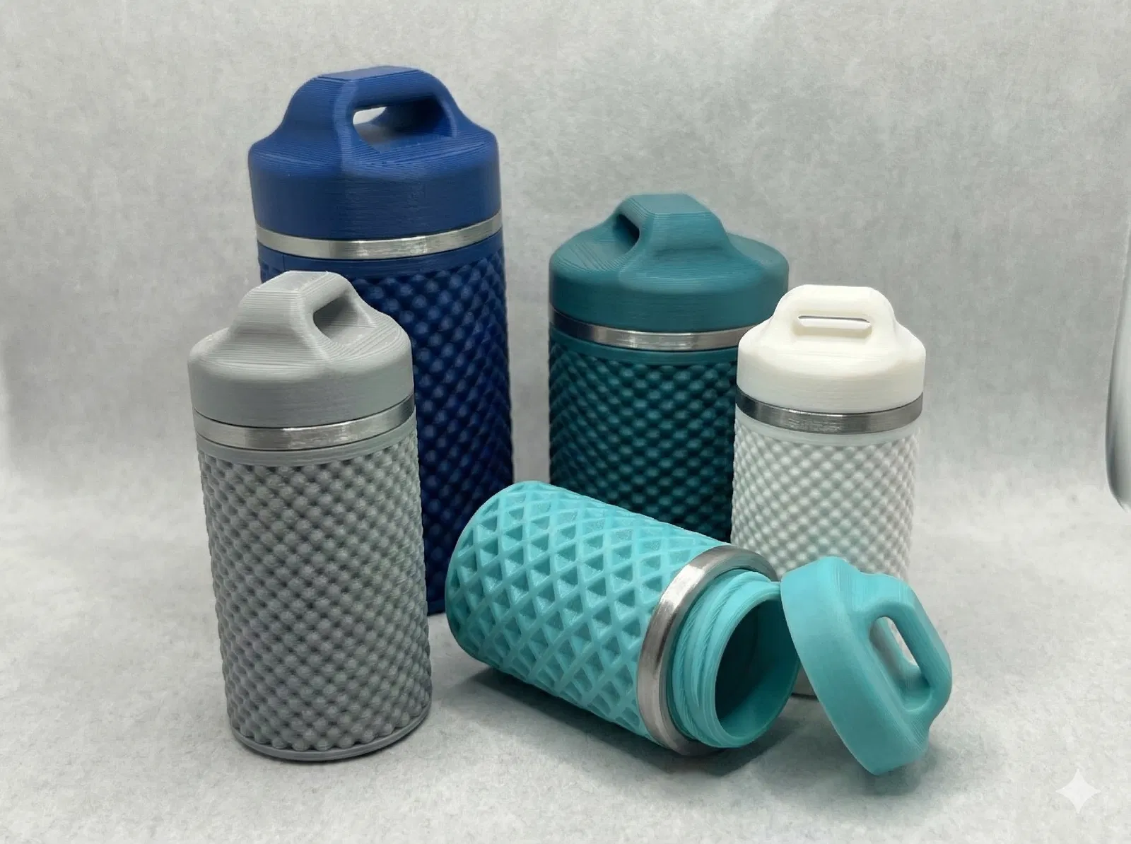 Capsule EDC vân knurled phong cách Bắc Âu giúp cất đồ nhỏ gọn, an toàn và nhìn đẹp. Nắp vặn ren có vòng móc gắn balo/móc khóa, kèm vòng màu để phân loại. Thiết kế No AMS/MMUPrint, in dễ, không cần supports.