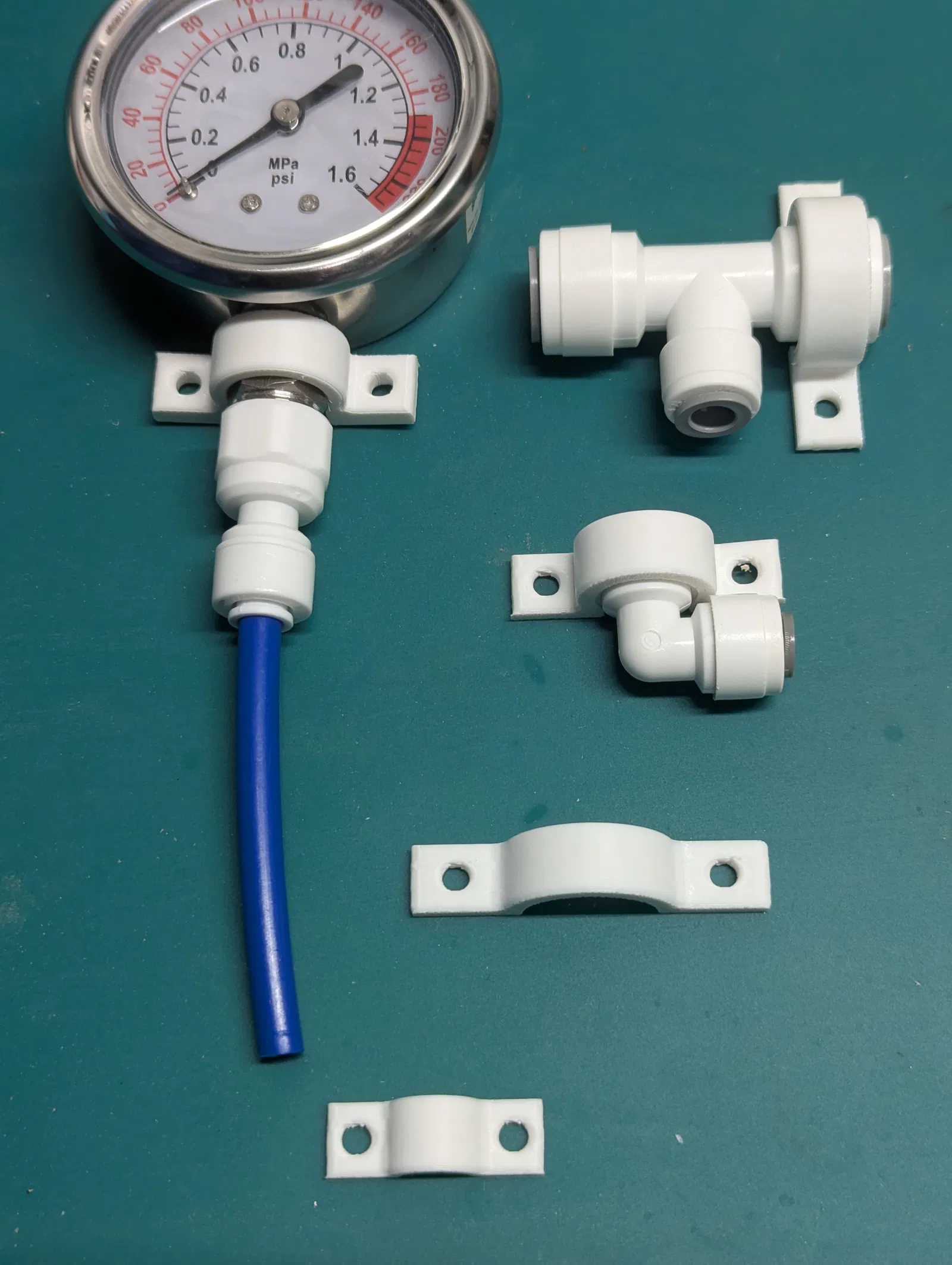 Bộ dây đai dùng để cố định các RO fittings lên ván hoặc bệ đỡ. Khuyến nghị dùng bản cao 15mm để chừa khoảng hở cho pressure gauge, reducer 3/8→1/4 và các van. In PETG, có thể scale cho vừa nhiều loại fitting.