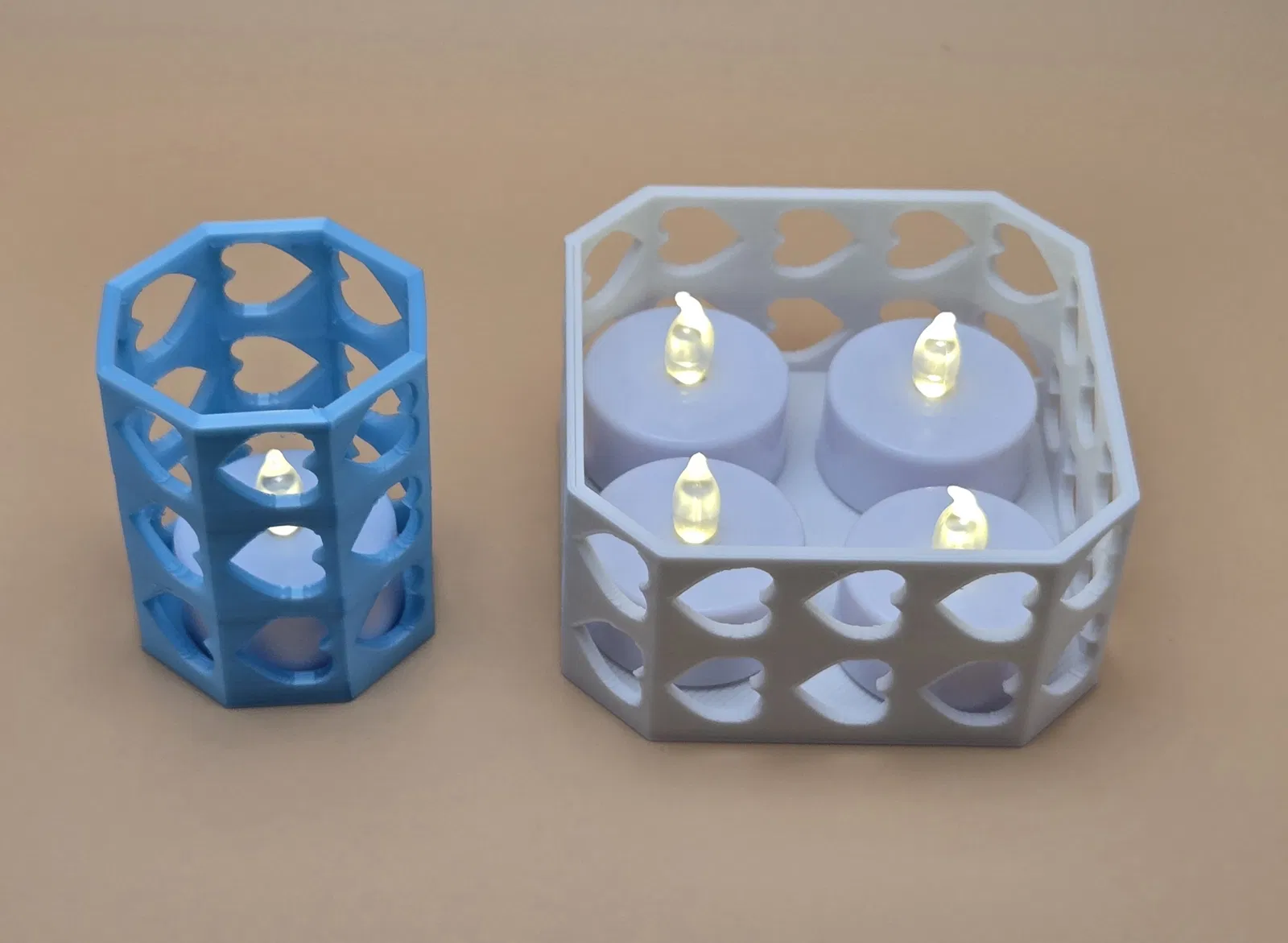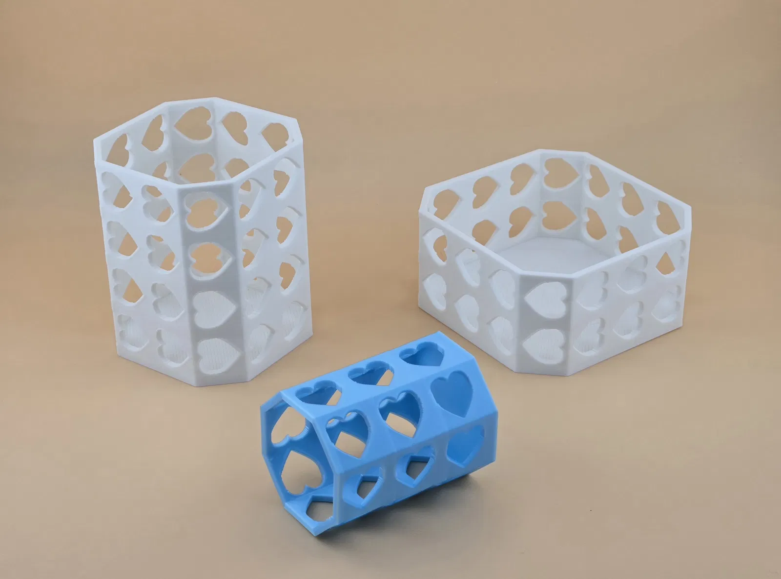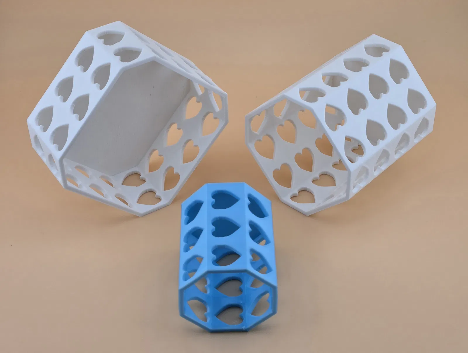 Thiết kế hướng tới tính thực dụng, đơn giản và dễ in. Các khay/hộp này có họa tiết lỗ hình trái tim tạo kiểu open frame nhẹ nhàng, mang vibe Valentine. Có 12 biến thể hộp bát giác để dùng đa năng, nhìn gọn gàng mà vẫn đẹp: