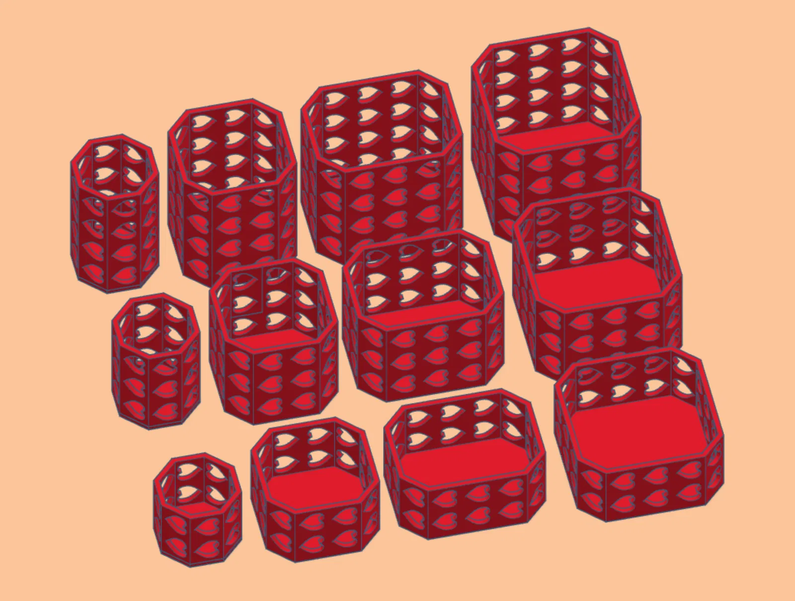 Bộ khay/giỏ bát giác open frame họa tiết trái tim, dễ in và không cần supports. Gồm 12 biến thể để làm pen holder, catch-all tray đựng chìa khóa/đồ lặt vặt, hoặc đỡ LED tea lights. Nhiều size: 3x3–5x5.