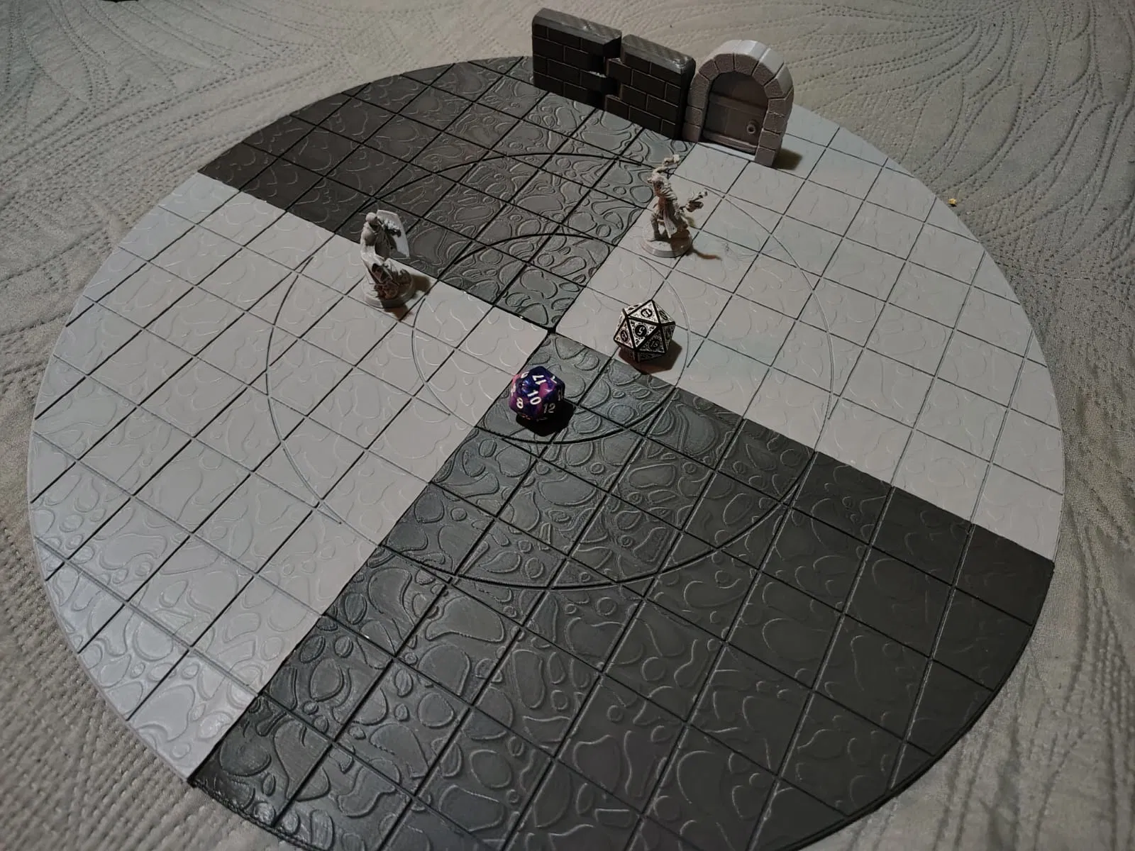Mẫu địa hình RPG dạng tile UDT dùng làm lưới 3x3 hoặc combat zone, có vòng tròn zone đánh dấu. Thiết kế gồm 4 phần ghép bằng rãnh nam châm 6x2 và gập lại gọn để cất giữ; in không cần supports.