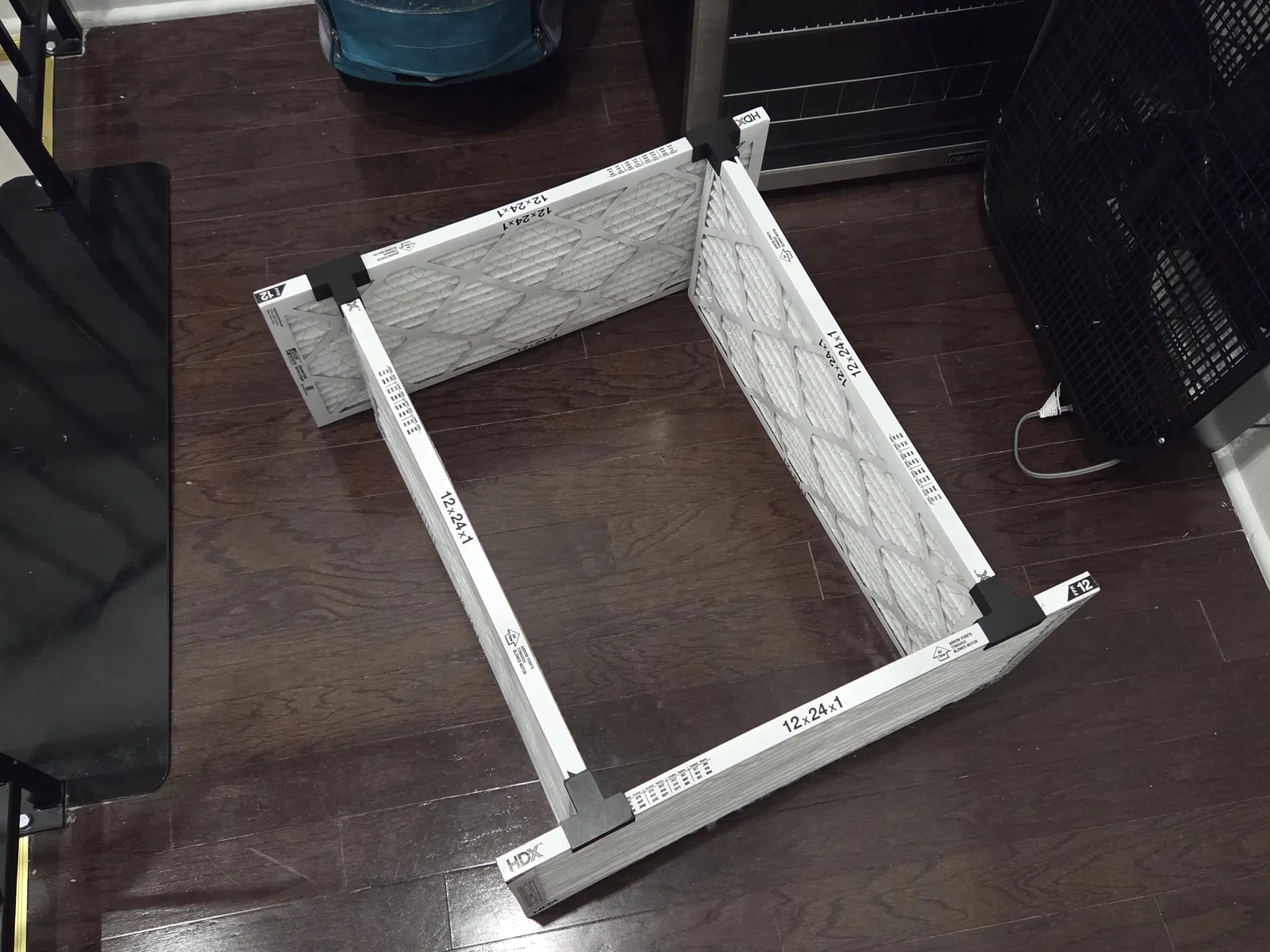 In tối thiểu 4 cái, tối đa 8 cái: mỗi góc một cái, cho cả phía trên và phía dưới. Ghép tất cả các tấm lọc thành một hình vuông. Nhớ để hai tấm sát đủ gần để cái quạt có thể đặt và tựa lên mép. Nếu filter của bạn lớn hơn quạt như setup của mình, thì sẽ có một khoảng hở cần che lại bằng miếng đồ dư, ví dụ như miếng bìa thùng carton hoặc miếng ván thừa.