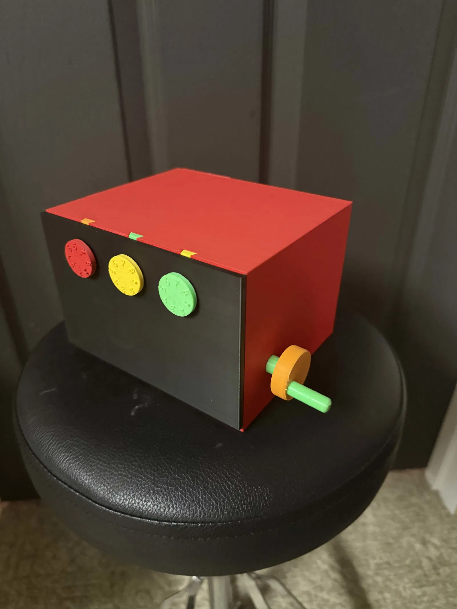 Két Spare Change Safe. Bạn tự đặt mã số 3 chữ số rồi quay bánh xe để mở. Trong video/hình thì mình chưa cắt khe bỏ tiền (lúc đó nghĩ thêm sau). Mình có thể kèm cả hai file vỏ ngoài: một bản có khe bỏ tiền và một bản không có. Cần dán keo khi lắp ráp.