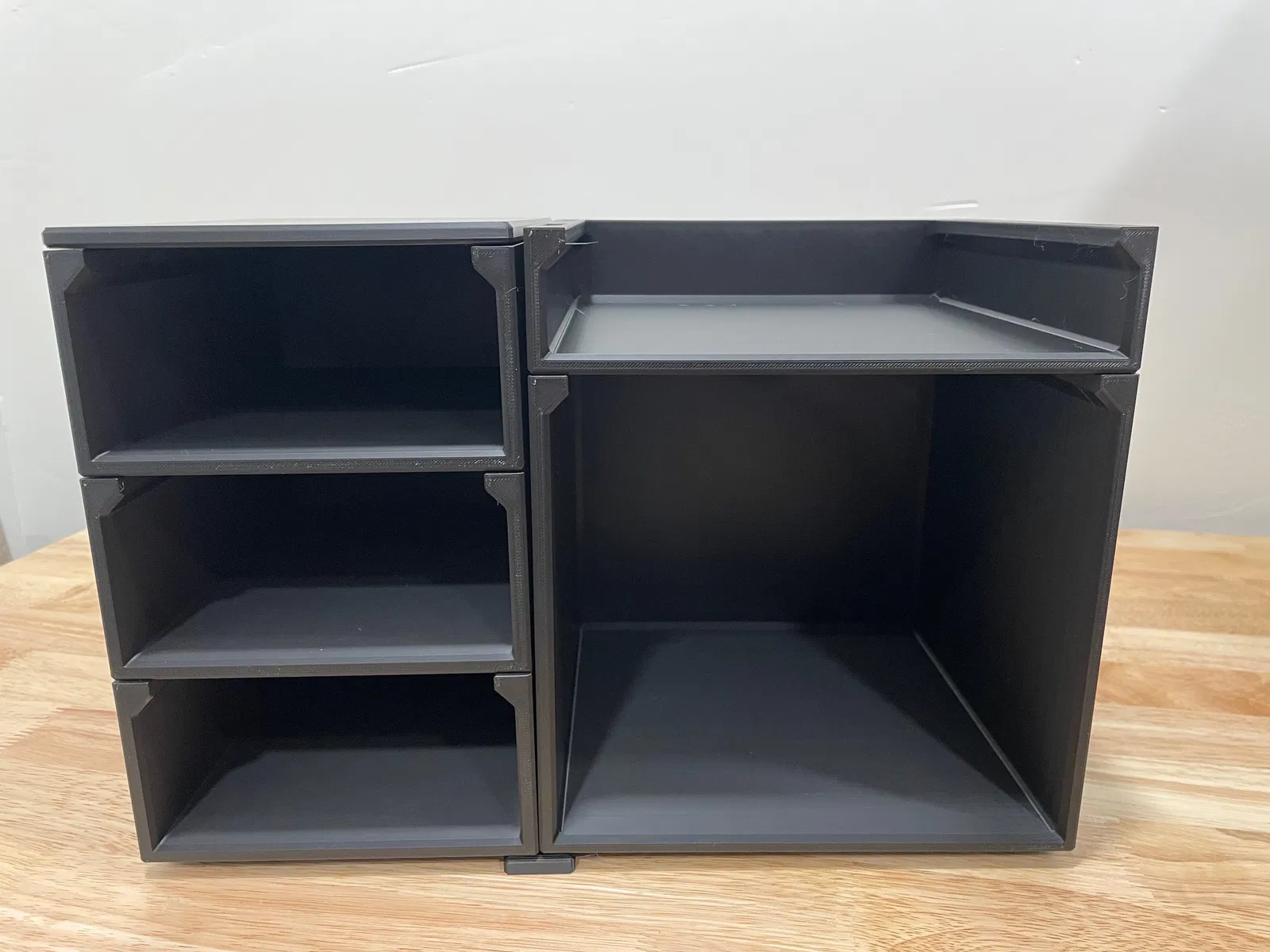 Hệ kệ xếp chồng đơn giản cho bàn làm việc, thiết kế parametric dễ scale trong CAD. Chỉnh được kích thước lòng trong và độ dày thành, in trên vách lưng không cần support. Có thêm top/bottom plates để ghép kệ.
