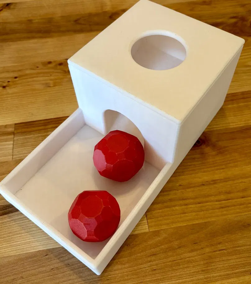 Đồ chơi cho bé theo kiểu Montessori giúp bé hiểu “object permanence”. File nguồn OpenSCAD có sẵn. In không cần supports; nắp snap-fit giữ chắc nhưng hơi khít. Có 2 phiên bản, bản v2 bo tròn.