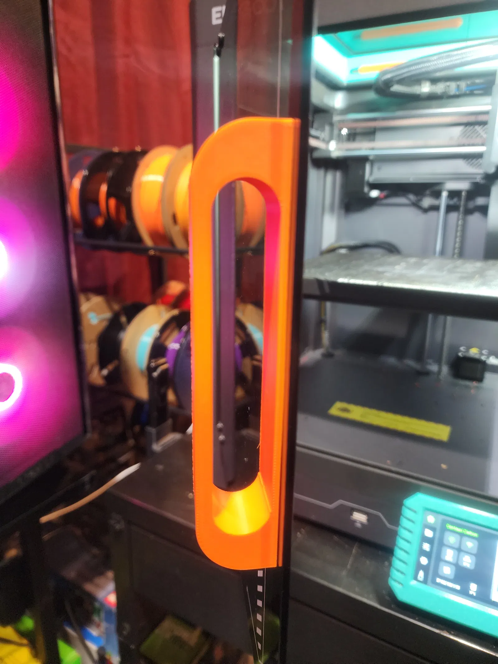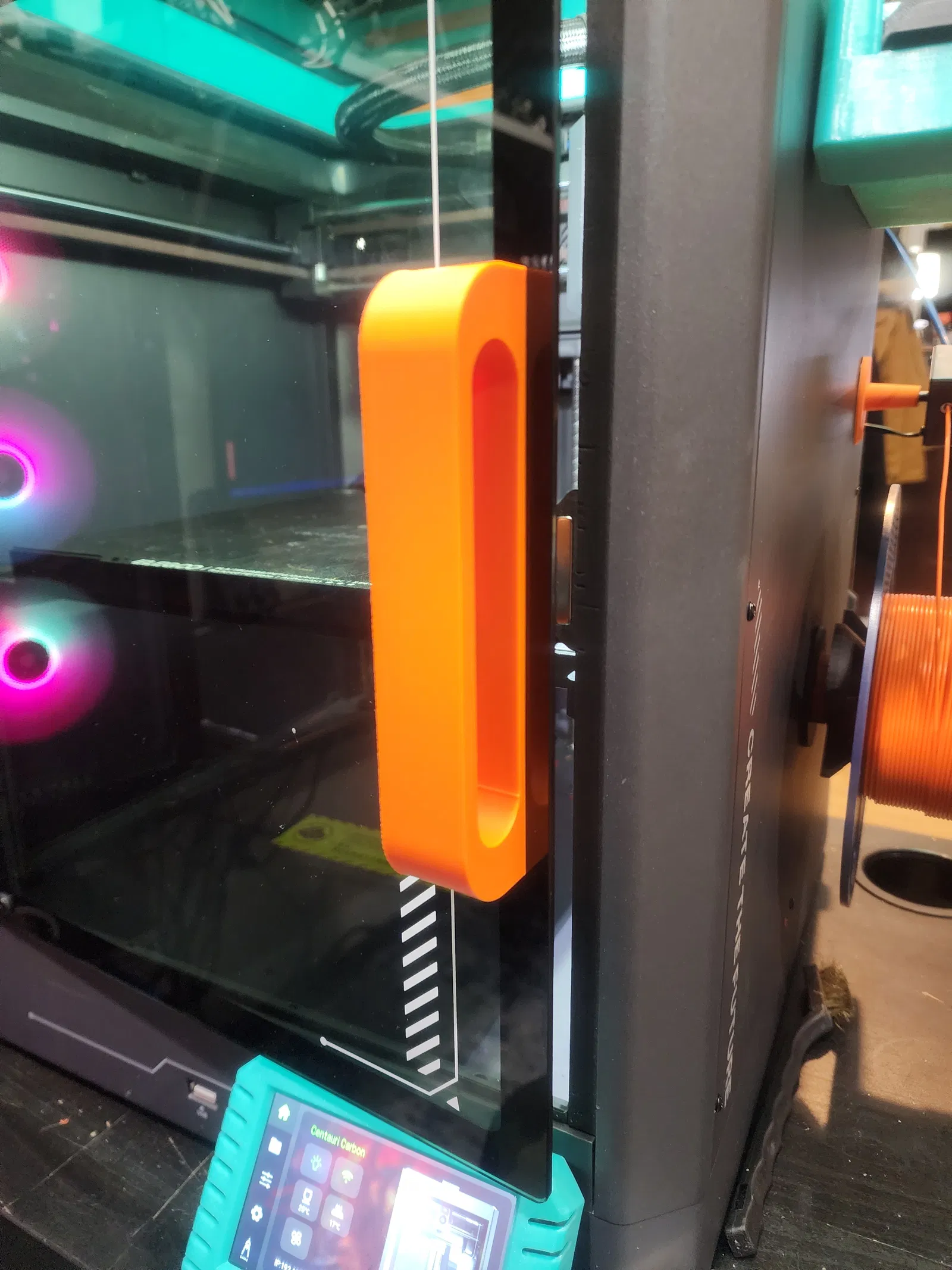 Tay nắm cỡ lớn, công thái học hơn cho cửa panel trước của Elegoo Centauri Carbon. Cần 2 vít M2x5 (không dùng vít zin để tránh bể lỗ). In theo hướng trong hình và dùng support cho các lỗ để ra sạch hơn.