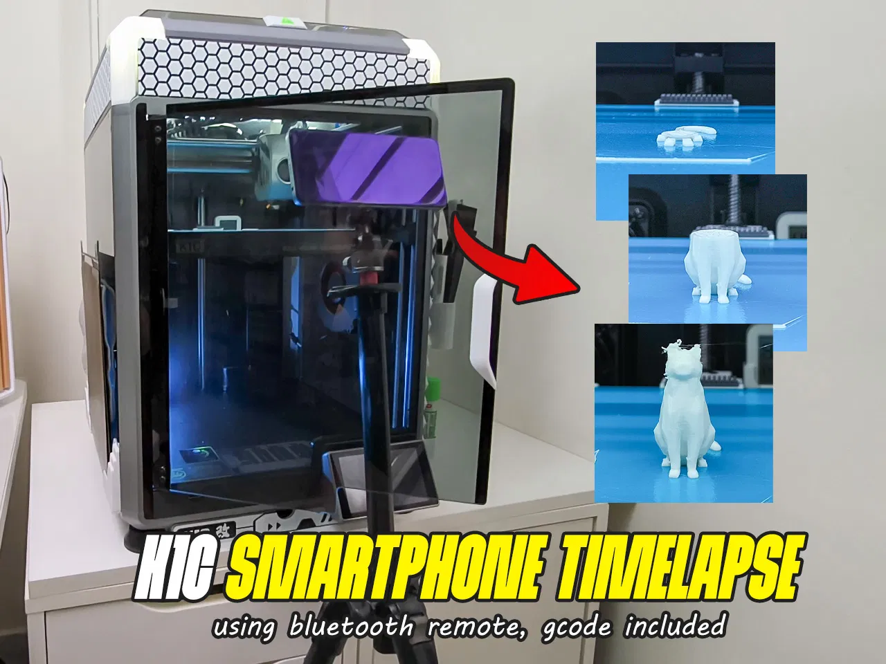 Bộ phụ kiện cho Creality K1C: giá đỡ Bluetooth remote và “trigger stick” để print head bấm remote mỗi layer, giúp quay timelapse bằng smartphone. Dán VHB, bắt 2 ốc M3*10, thêm GCode trong slicer là chạy.