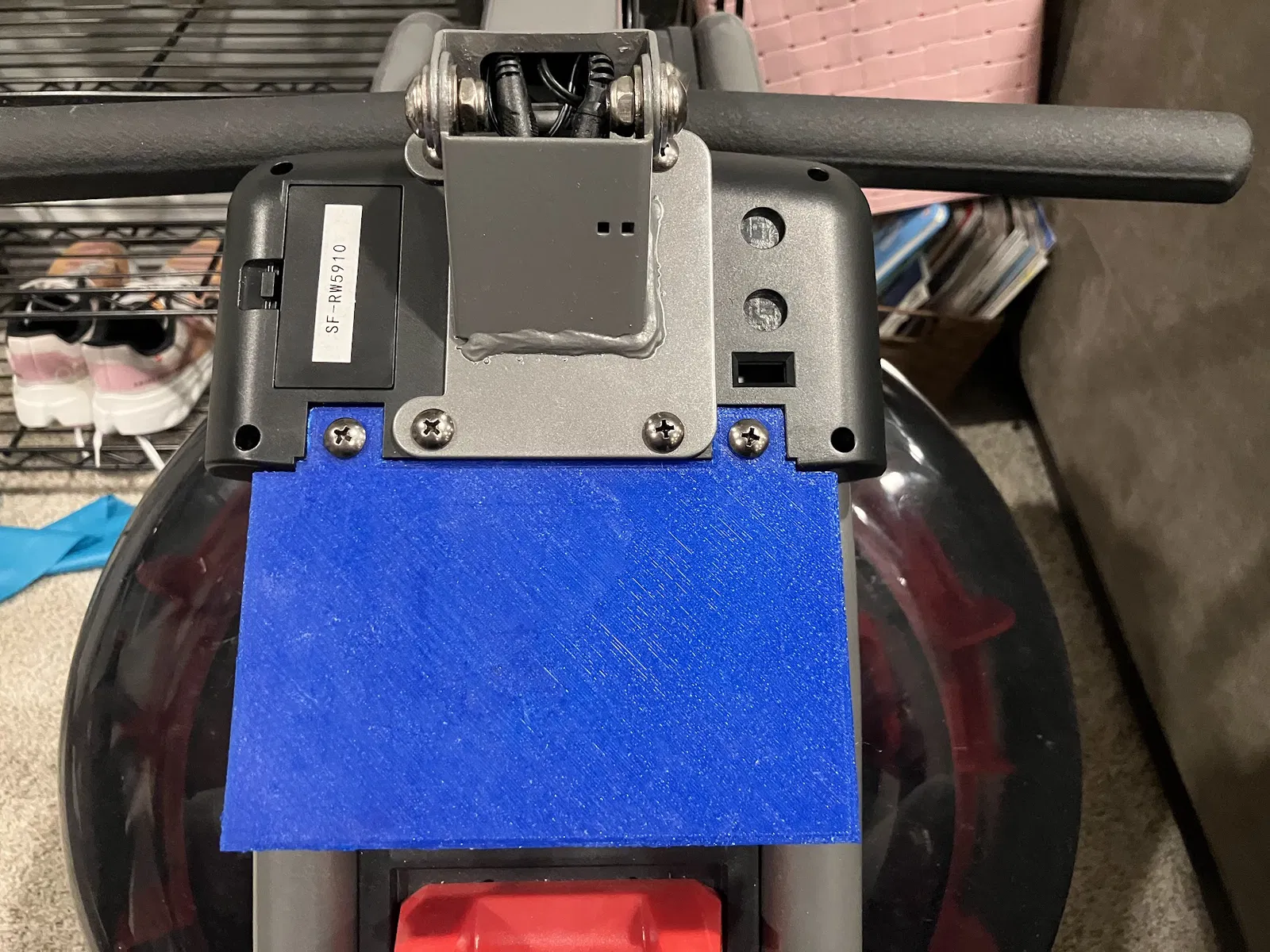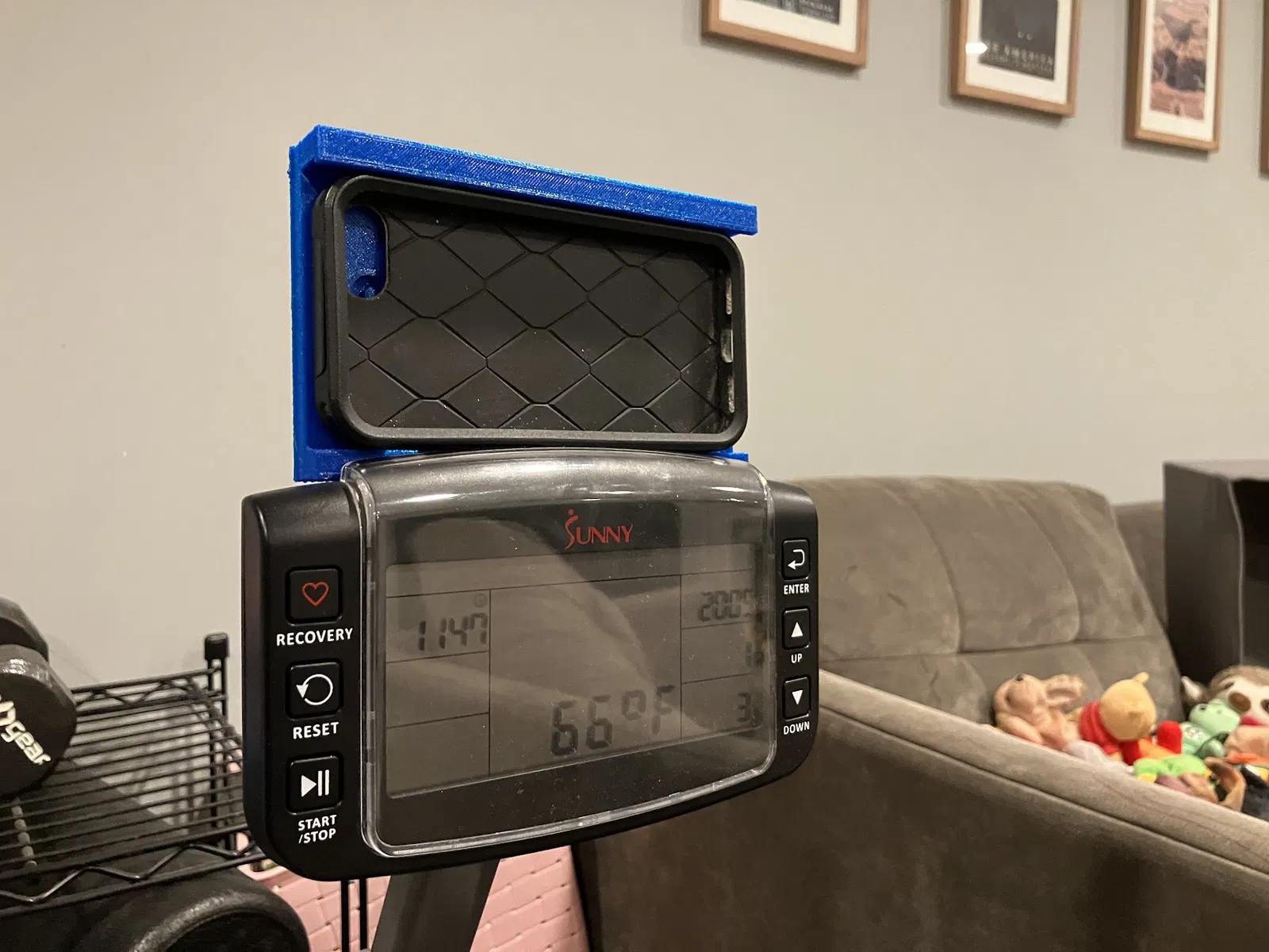 Chân đỡ theo máy bị gãy khi vận chuyển nên mẫu này là ngàm/đế giữ điện thoại thay thế cho Sunny Rower SF-RW5910 (RW-5910). In PLA, cần supports dưới ngàm lắp, dùng lại hardware sẵn có, infill 50% để chắc chắn.