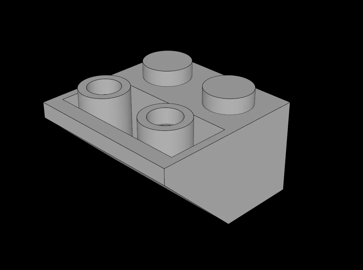 Mẫu 3D tương thích với hệ thống LEGO: (76959.dat) Slope Brick 45 kích thước 2x2 dạng inverted, có pin đáy tròn và vòng chặn (inner stopper ring) bên trong.